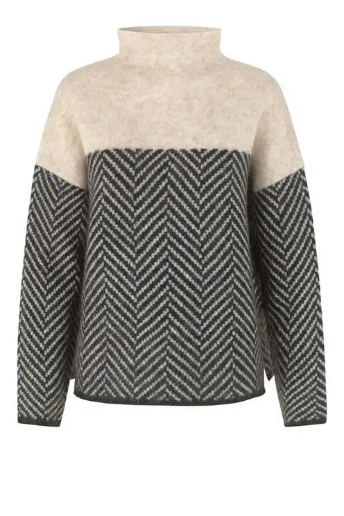 Made of a fine wool blend, this pullover offers soft comfort and cosy warmth. Its distinctive zigzag pattern adds a hint of sophistication that will brighten up your looks on colder days. With a funnel collar for optimal protection from the cold and dropped shoulders for a relaxed fit, it pairs perfectly with either a pair of jeans or a corduroy skirt for an elegant and casual look.