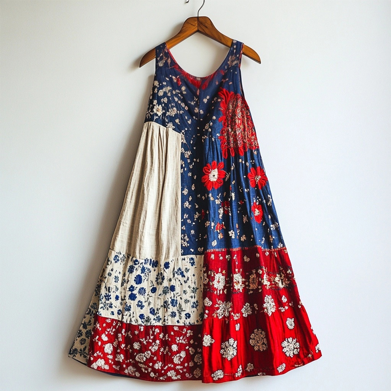 American Flag Color Inspired Floral Patchwork Linen Midi Dress