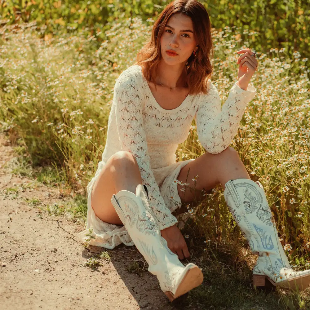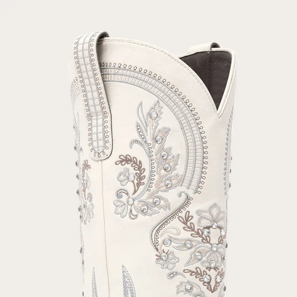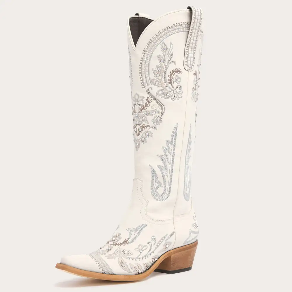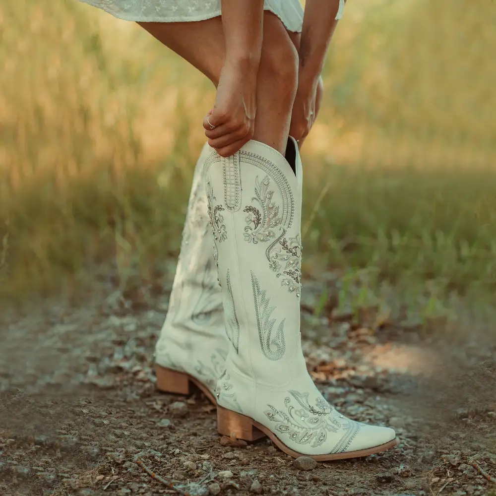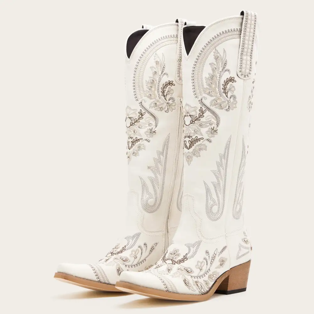 Step into timeless elegance with our Aurelia Embroidered White Cowboy Boots. These boots seamlessly blend traditional craftsmanship with modern style, designed for the sophisticated urban woman. Made from premium quality leather, they feature intricate floral embroidery that adds a touch of luxury and femininity to your wardrobe. The sleek white color enhances the detailed patterns, while the durable wooden heel provides both style and comfort. With a classic pointed toe and pull-on tabs, these boots are as practical as they are beautiful, making them ideal for both casual outings and special occasions.