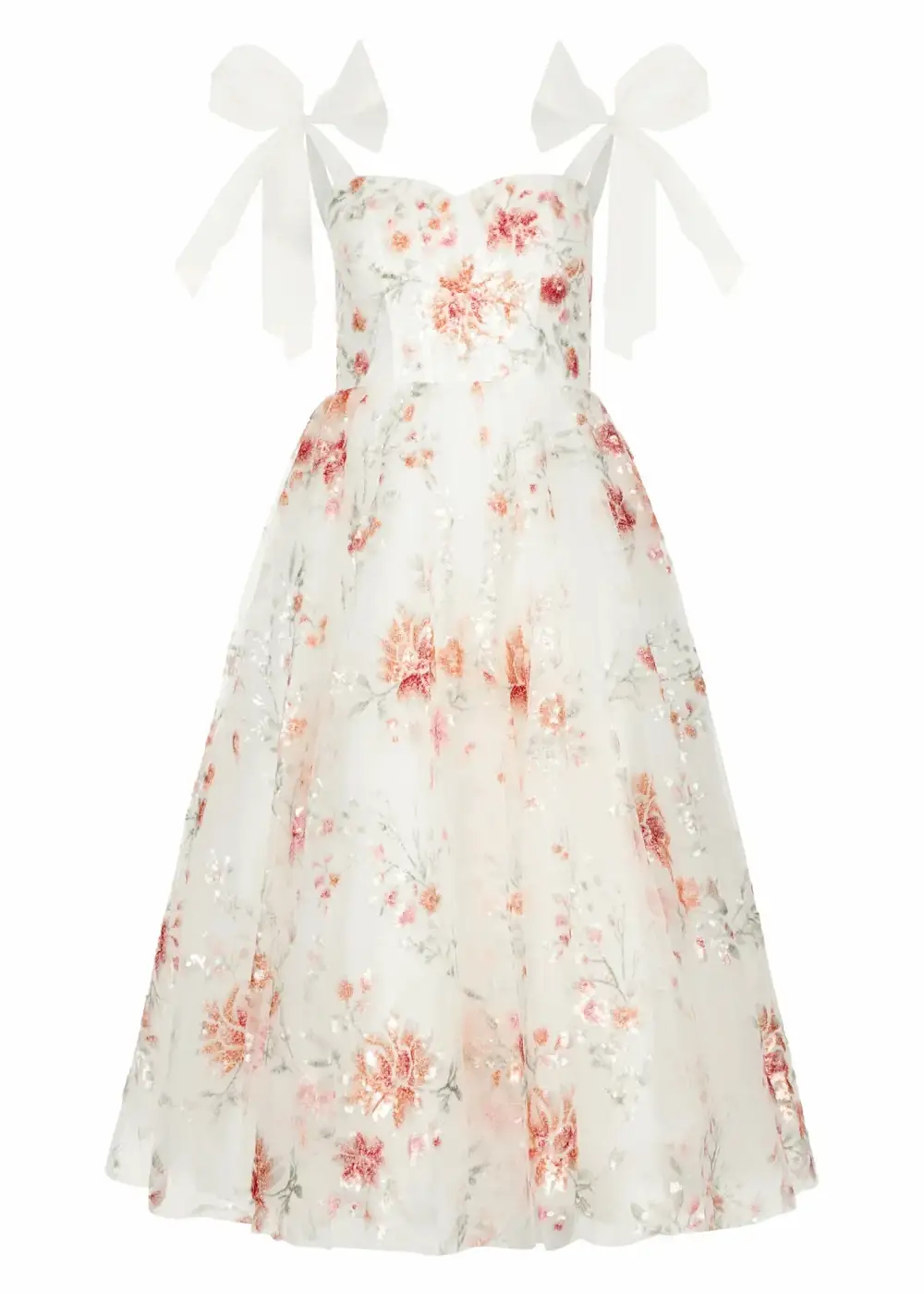 Embrace the dazzling beauty of this sequined floral midi, which exudes a bold allure. Blended hues of muted red and orange evoke a theme of gentle passion. With adjustable tie sleeves and a flattering V neckline, it's a flattering ensemble for any occasion, radiating elegance and charm. Choose this dress for any event, and you're sure to make an unforgettable impression.