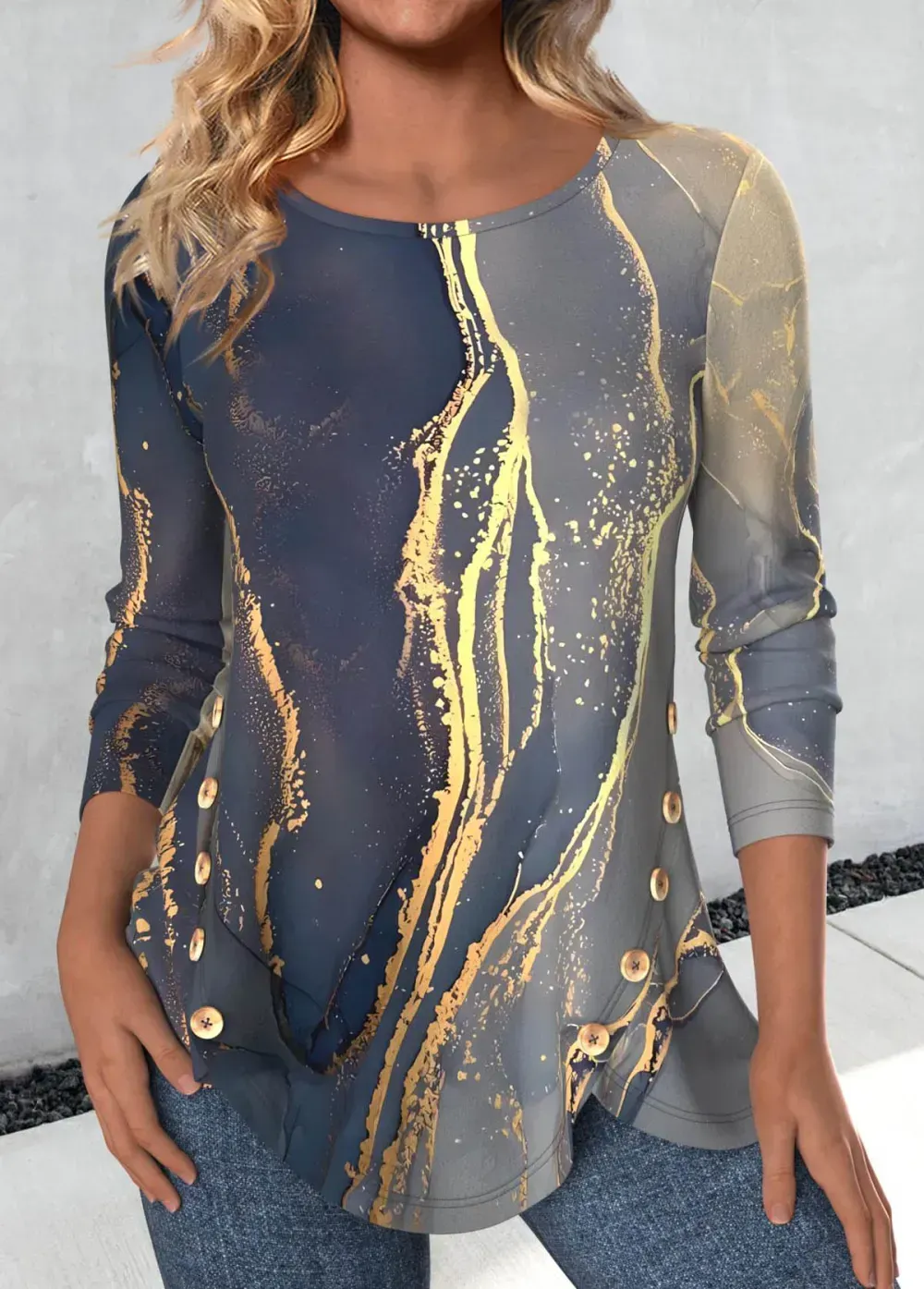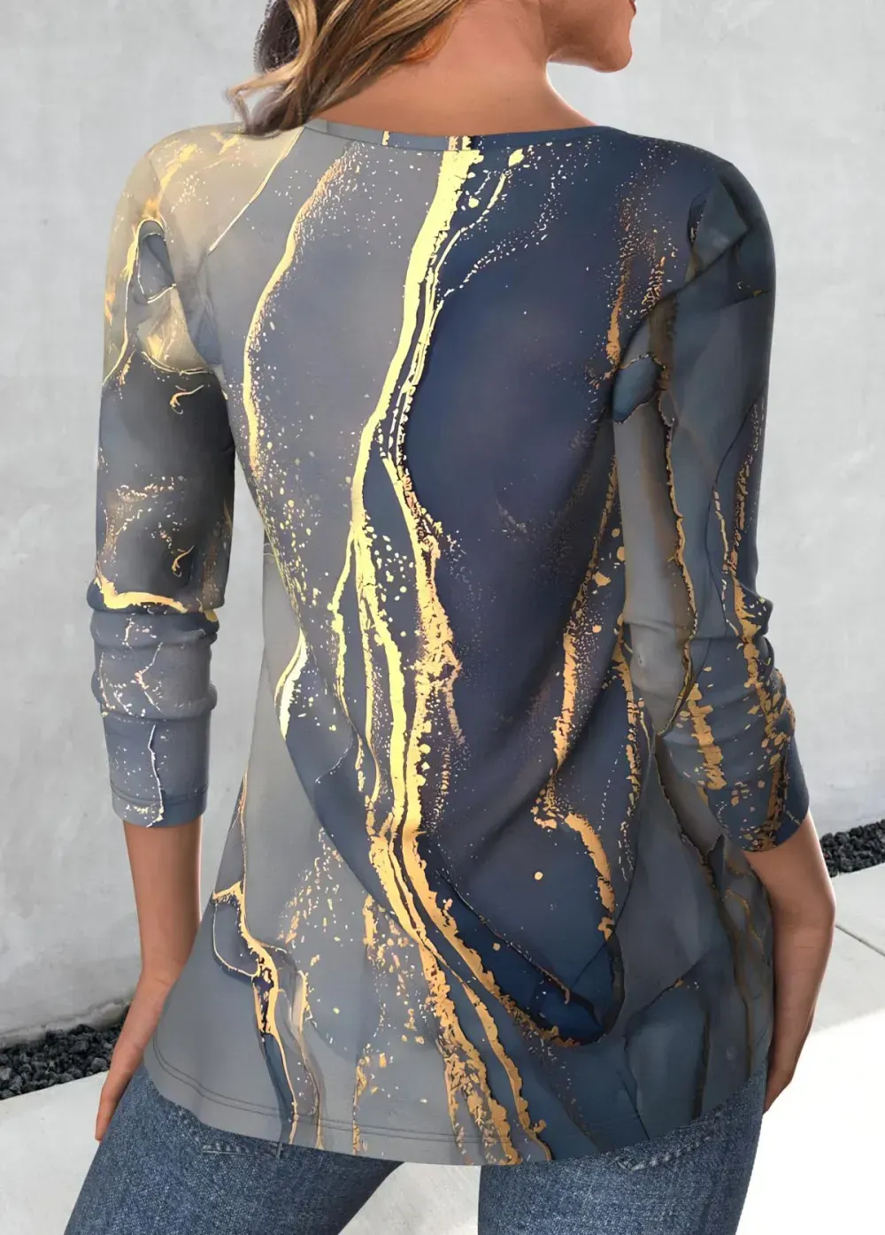 Blue Button Marble Print Long Sleeve T Shirt