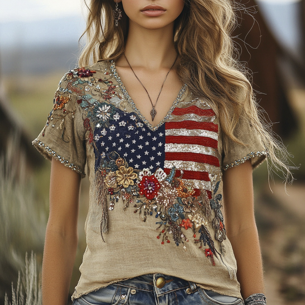 Boho Vintage Sequin Floral Independence Day Women's V-neck T-shirt 430714