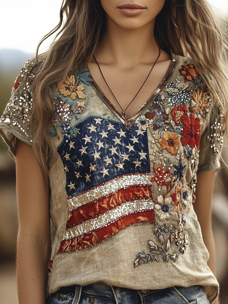 Boho Vintage Sequin Floral Independence Day Women's V-neck T-shirt