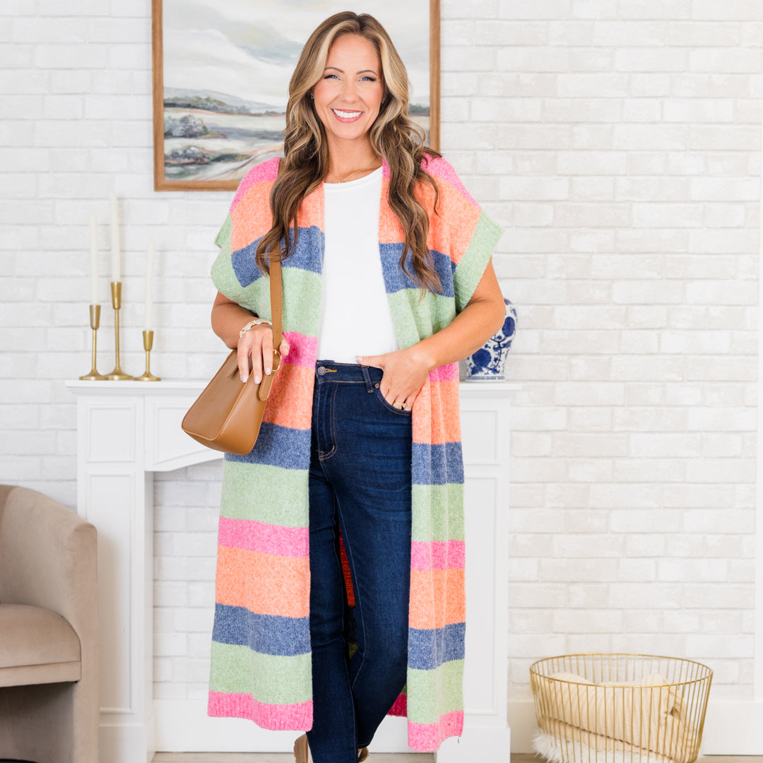 Stay cozy and stylish all year round with this cardigan! This multi-colored, long knitted cardigan features a unique color block design and short sleeves! Perfect for layering on cooler days or adding a pop of color to any outfit! Upgrade your wardrobe with this versatile and trendy cardigan!