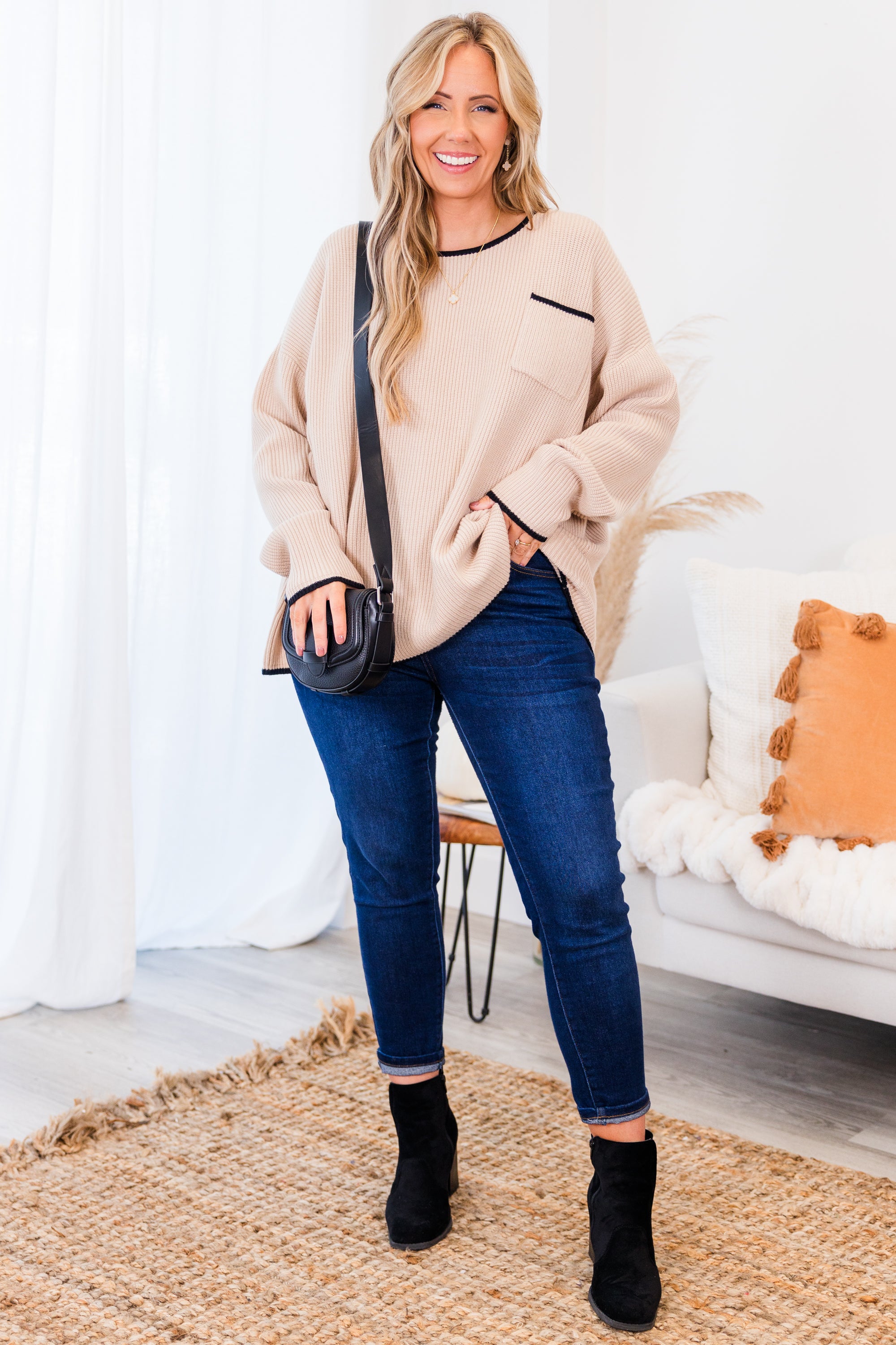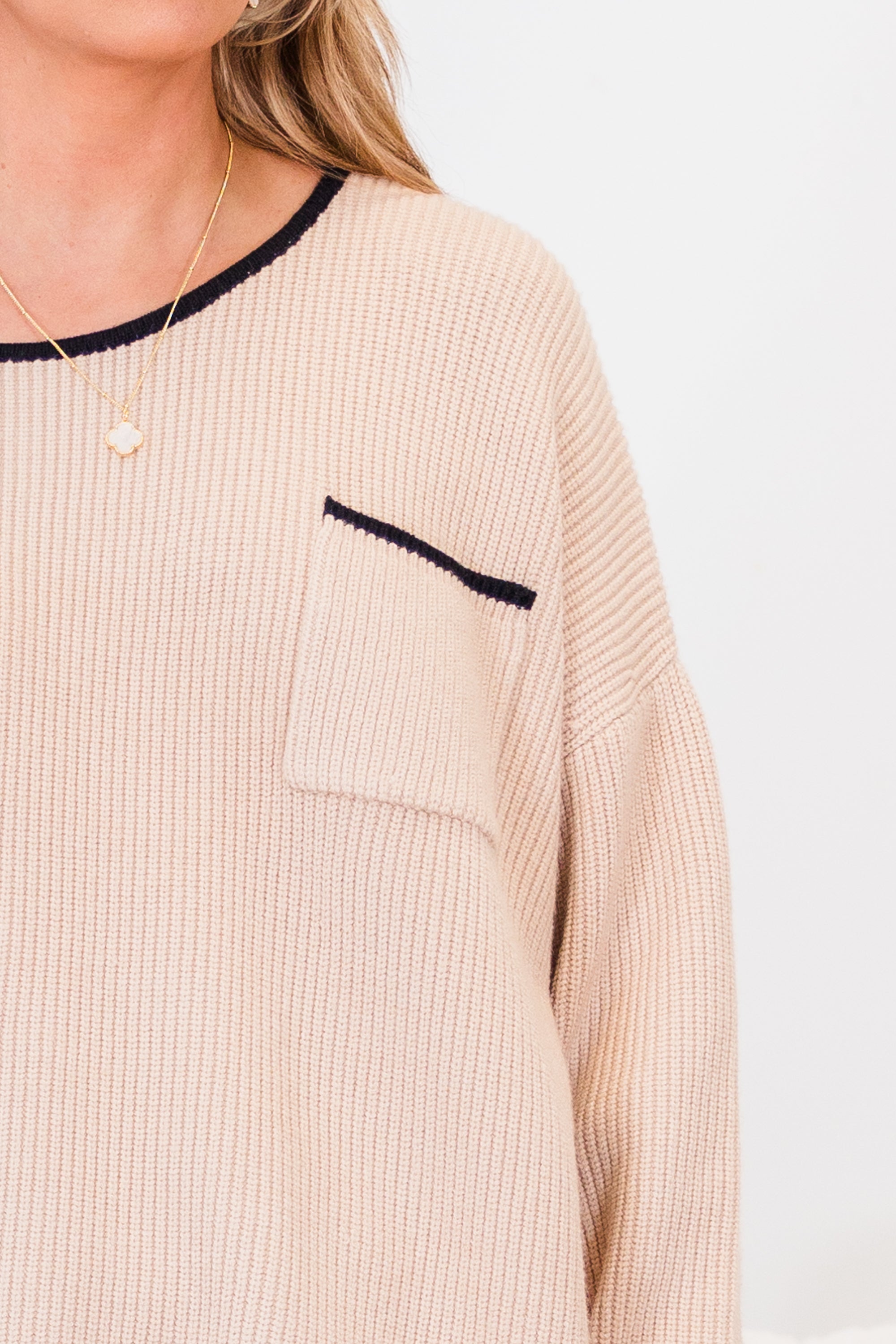 Experience ultimate comfort in our Can't Keep Going Sweater! Thick ribbing creates a soft, lush feel, perfect for the colder months. Stay warm with long sleeves and a single front pocket, while contrasting colors add a touch of style. Don't let the cold weather slow you down - keep going with this sweater!