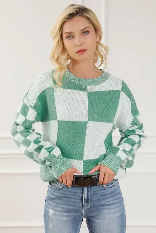 Checkered Drop Shoulder Long Sleeve Sweater AC