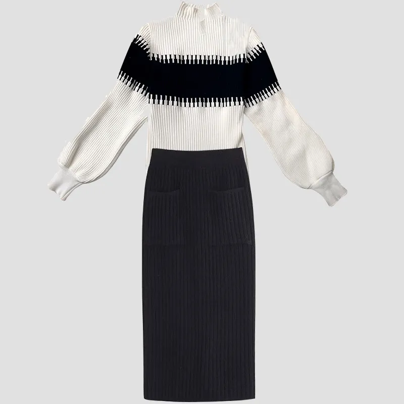 Chic Color Block Stand-up Collar Knit Sweater Two-piece