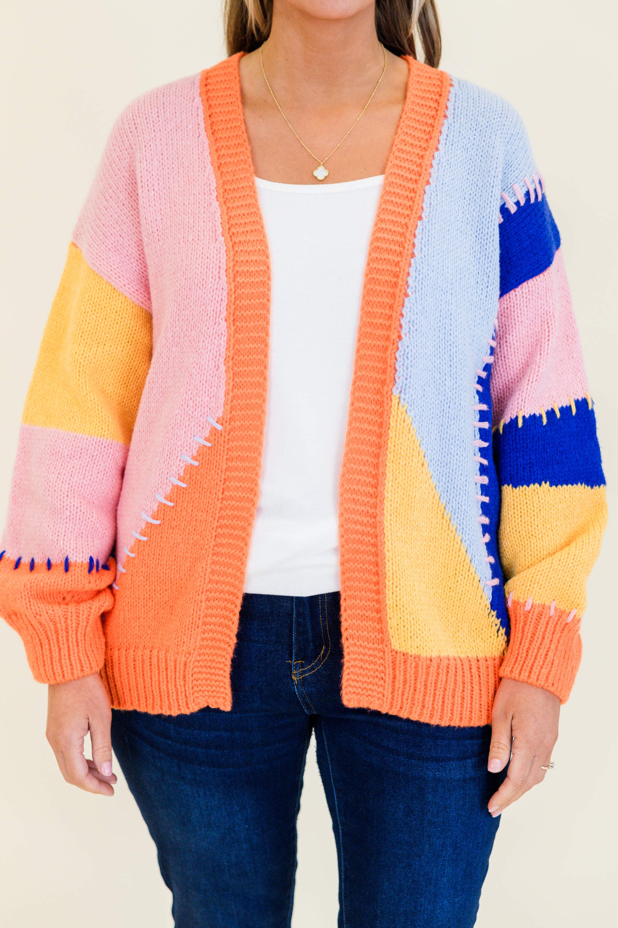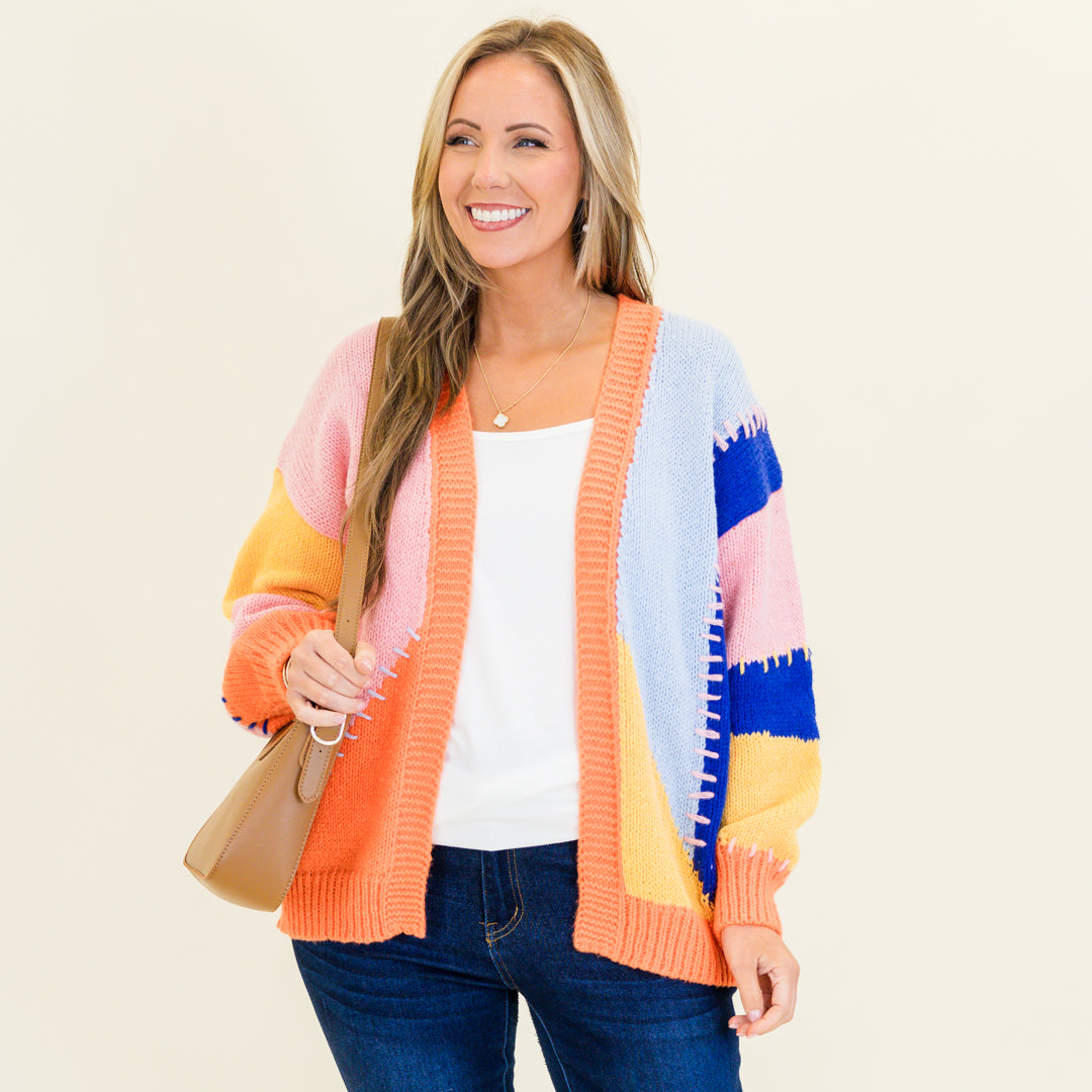 This cardigan in vibrant orange boasts trendy color-blocking and exposed stitching for a stylish touch! Stay warm and chic while effortlessly adding a pop of color to any outfit! Expertly crafted for a flawless fit, this cardigan is a must-have for any fashion-forward individual!