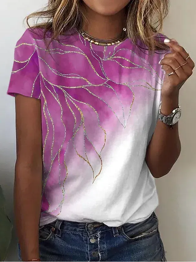 Crew Neck Ombre Color Block Leaves Floral Casual Cotton-Blend T-Shirt/Tee