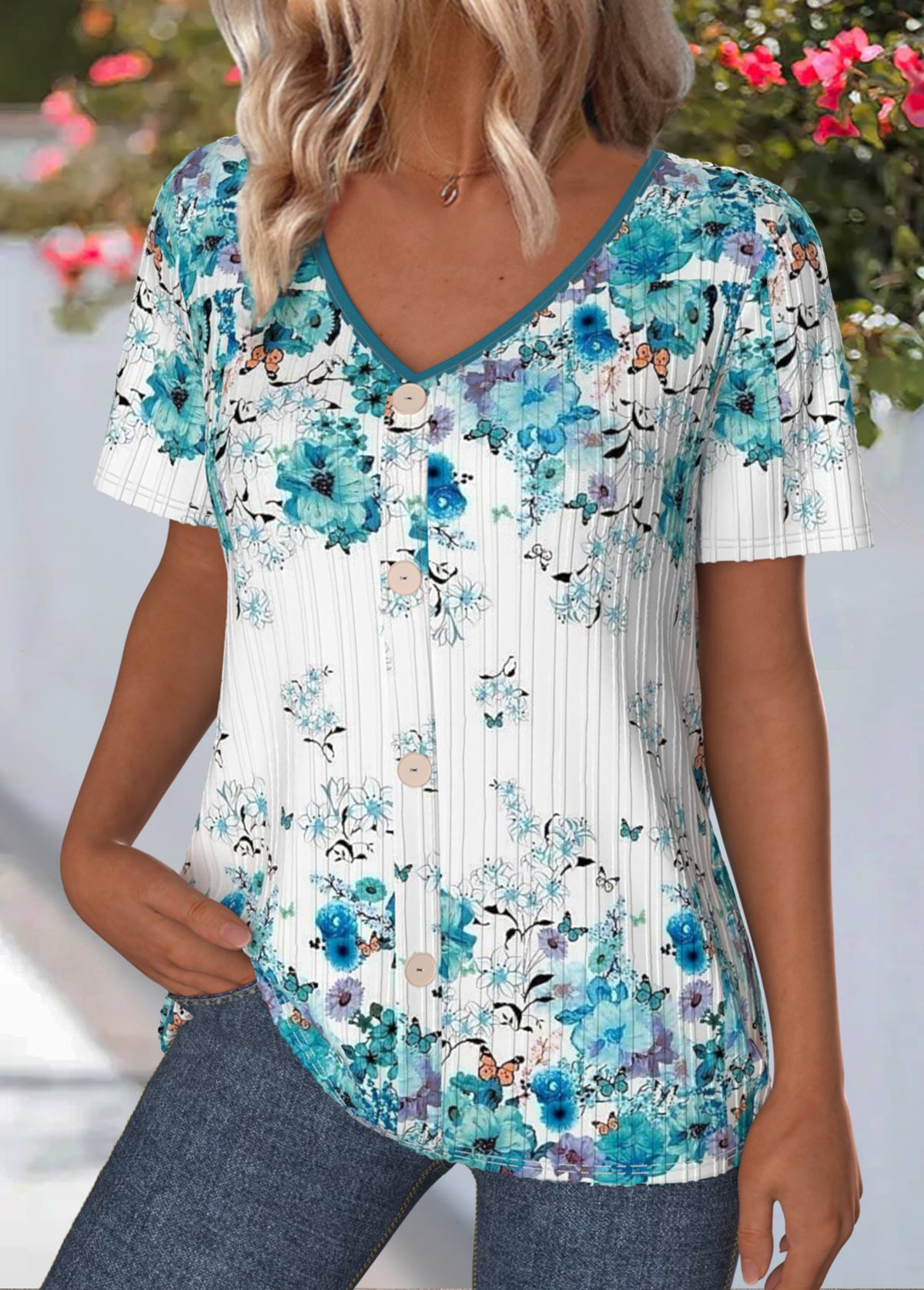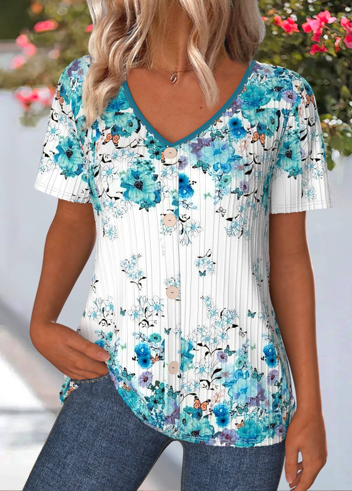 Cyan Floral Print Short Sleeve V Neck T Shirt