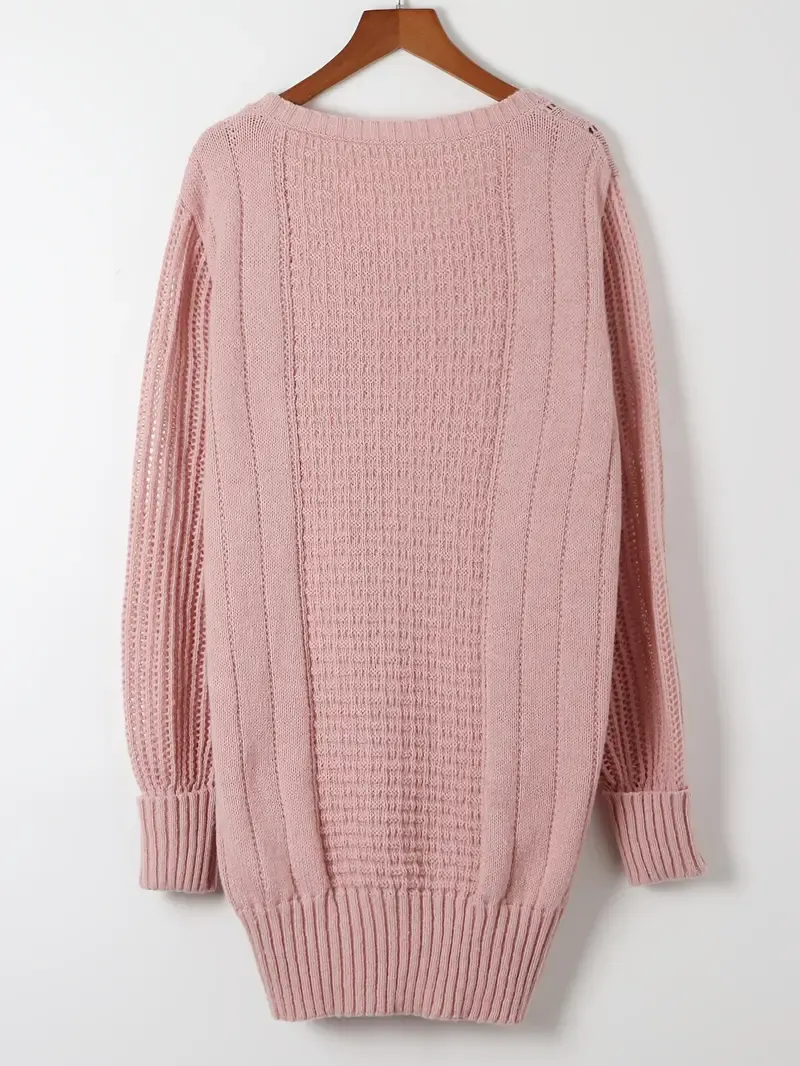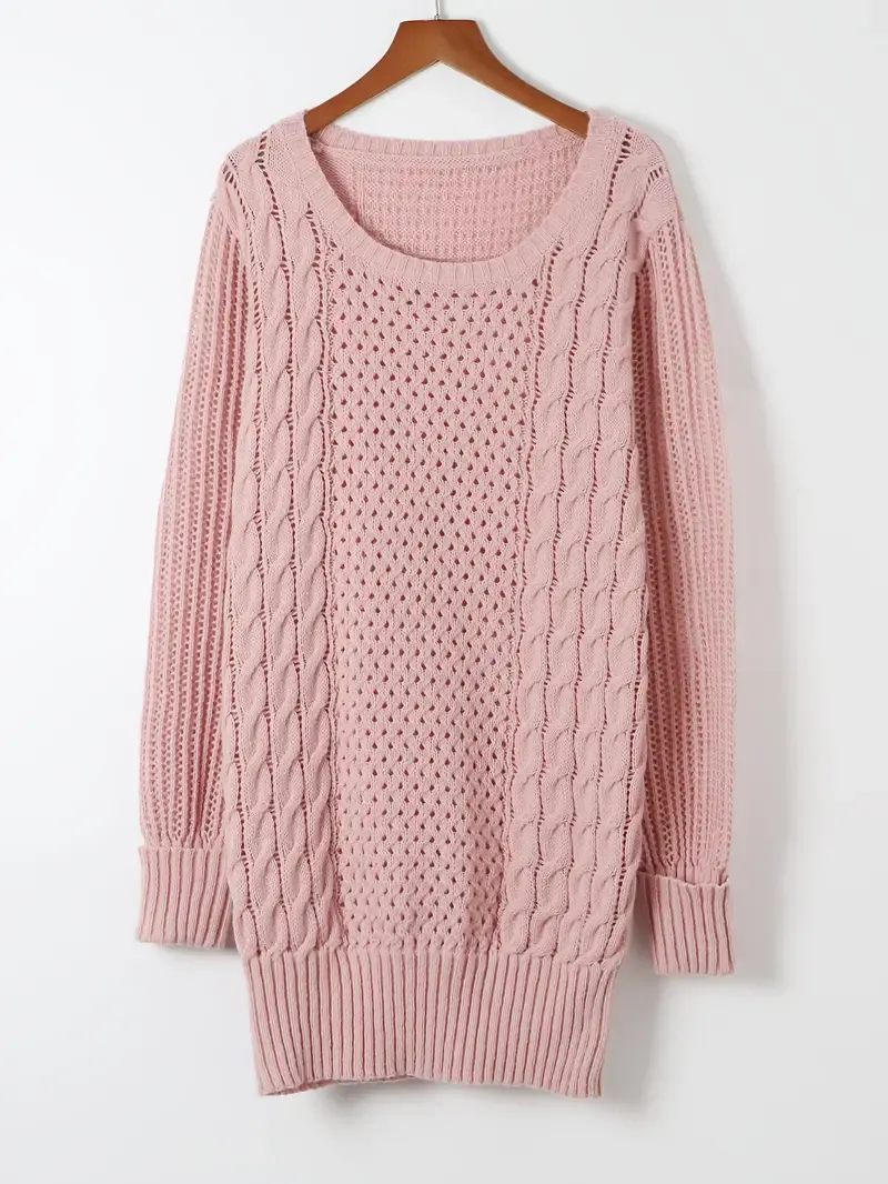 Elegant Pink Knit Sweater Dress for Women - Casual Long Sleeve, Round Neck, Bodycon Midi with Cable Knit Pattern, Perfect for Fall/Winter, 100% Polyester