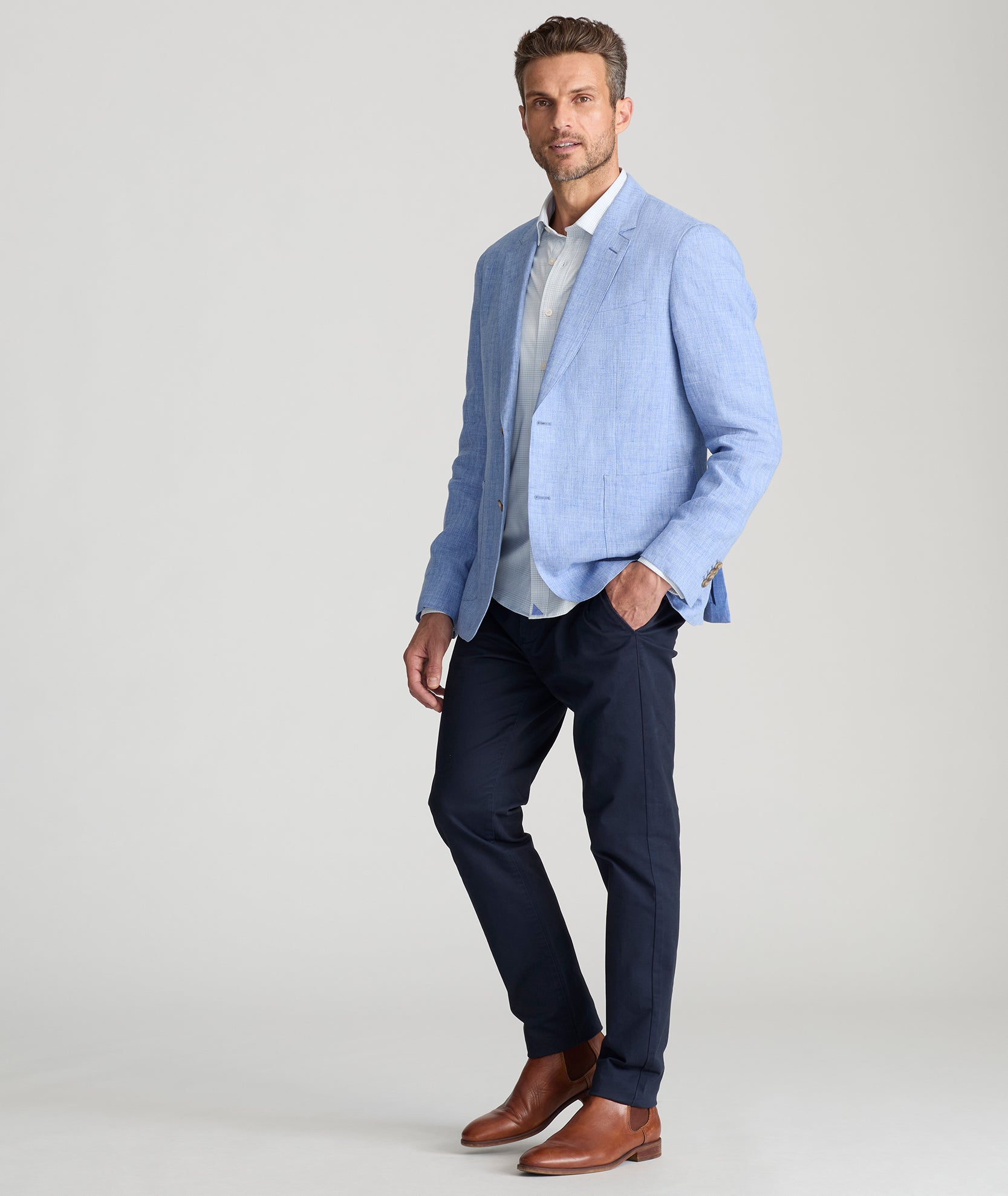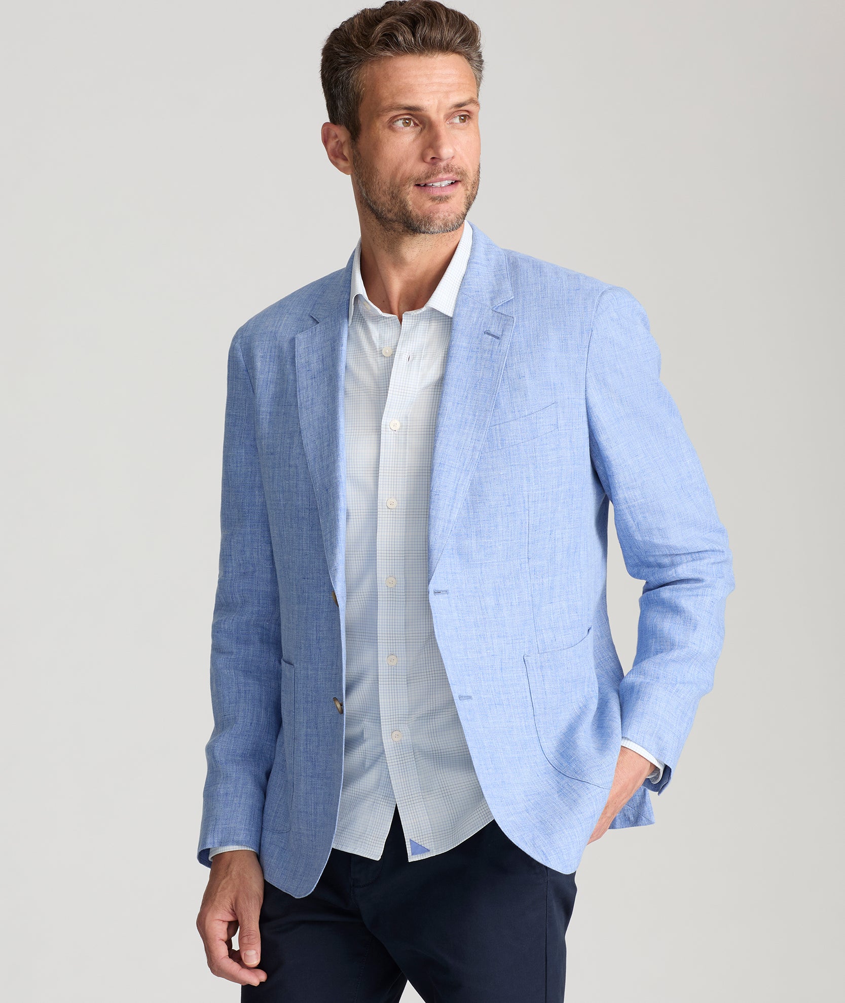 Dressing up when it's still warm out is tough. Make your life a little more comfortable with this lightweight linen sport coat that's ideal when autumn feels more like summer. Made with luxe, breathable linen from Italy’s exceptional Sondrio mill, it’ll help you stay cool and comfortable while still looking sharp for all your special events. You’ll love its classic solid color and modern length, and it pairs perfectly with any UNTUCKit shirt. Just add our Classic Chino Pants to look great and feel relaxed at your next wedding.