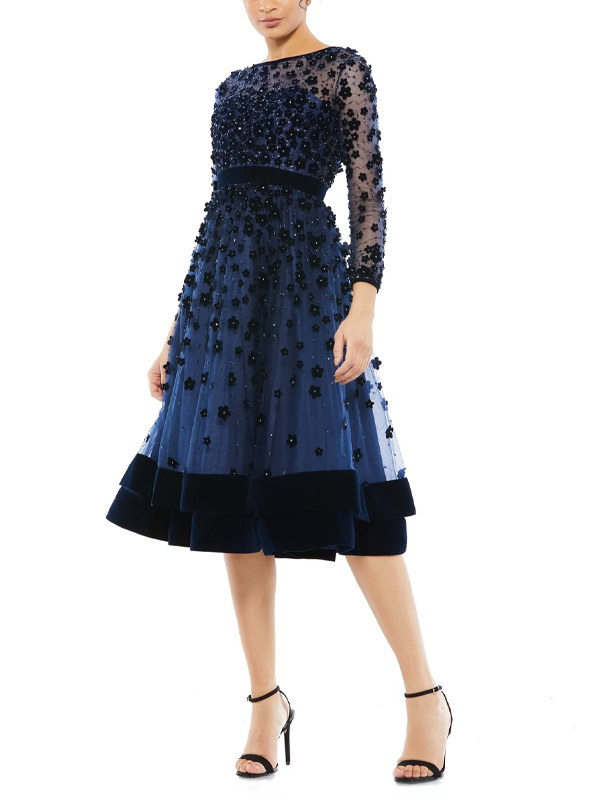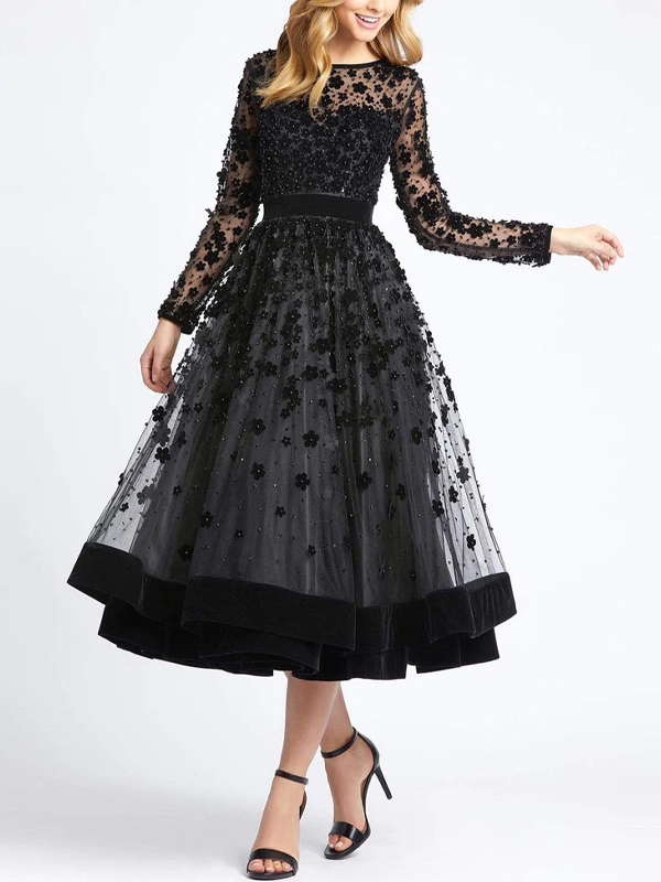 Embellished Sheer Long Sleeve A-Line Midi Dress