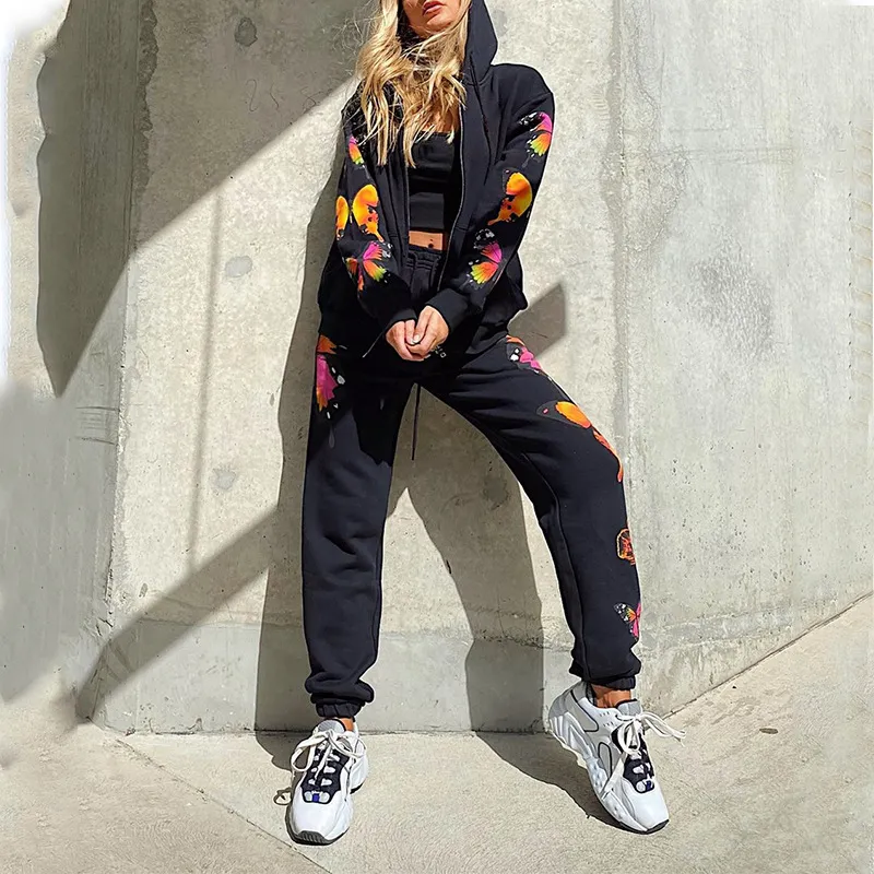 Fashion Butterfly Print Hooded Casual Sweatshirt Set