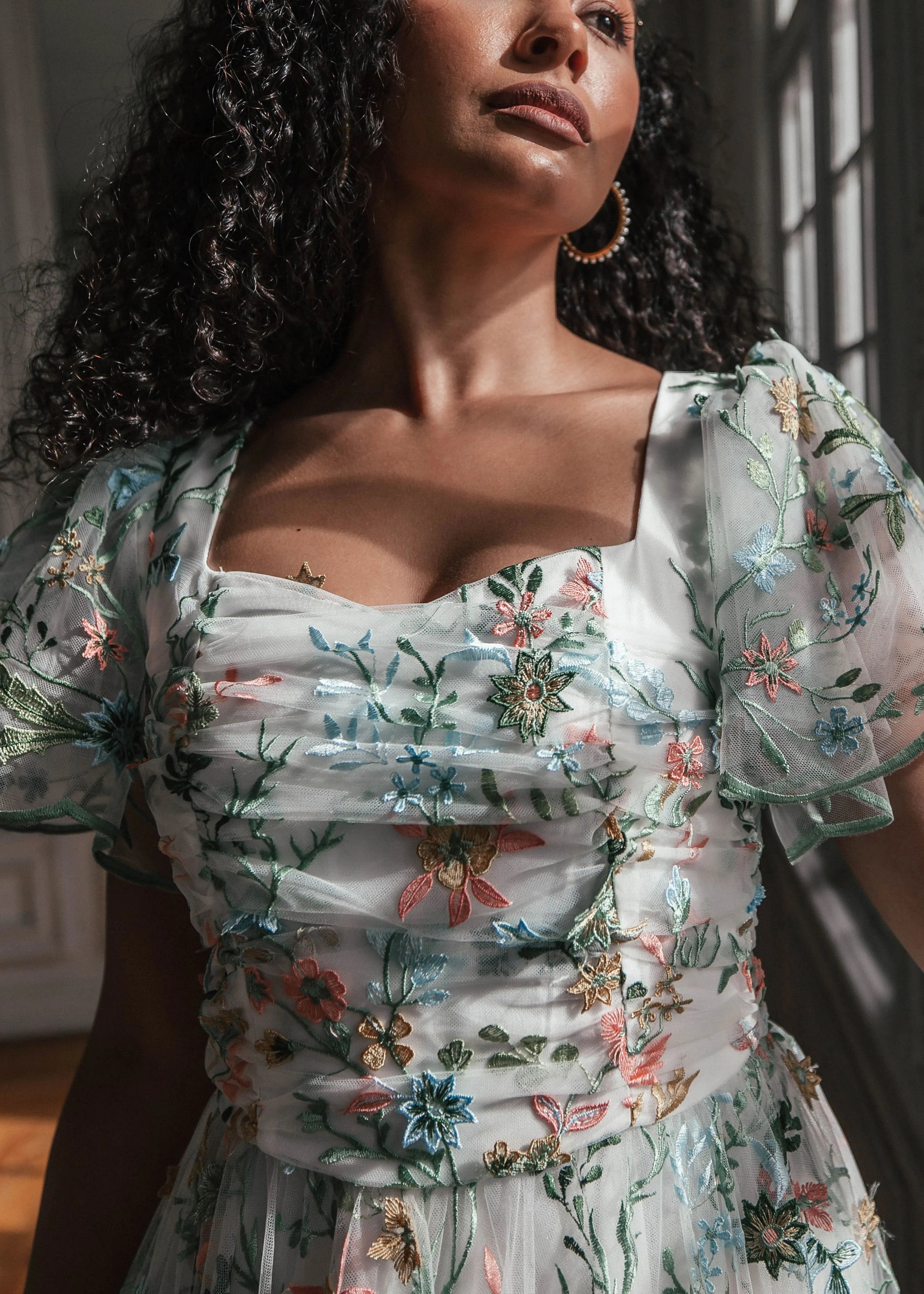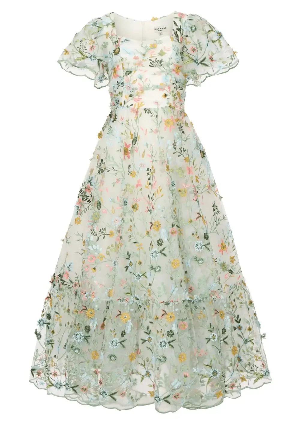 Love is in full bloom. Adorned with lush embroidered florals, this exquisite gown exudes the elegance of spring. A ruched, accentuated bodice paired with flutter sleeves imbues a sense of gentle beauty. Scalloped edges at the hem and lined along the sleeves remind the wearer that love is ever in the details. Take the romance of the meadow with you everywhere you go, and watch your happily ever after blossom.