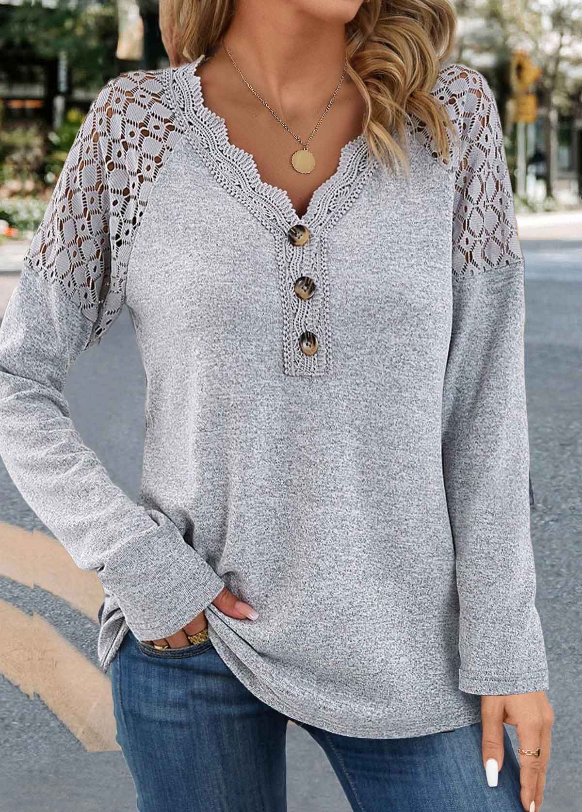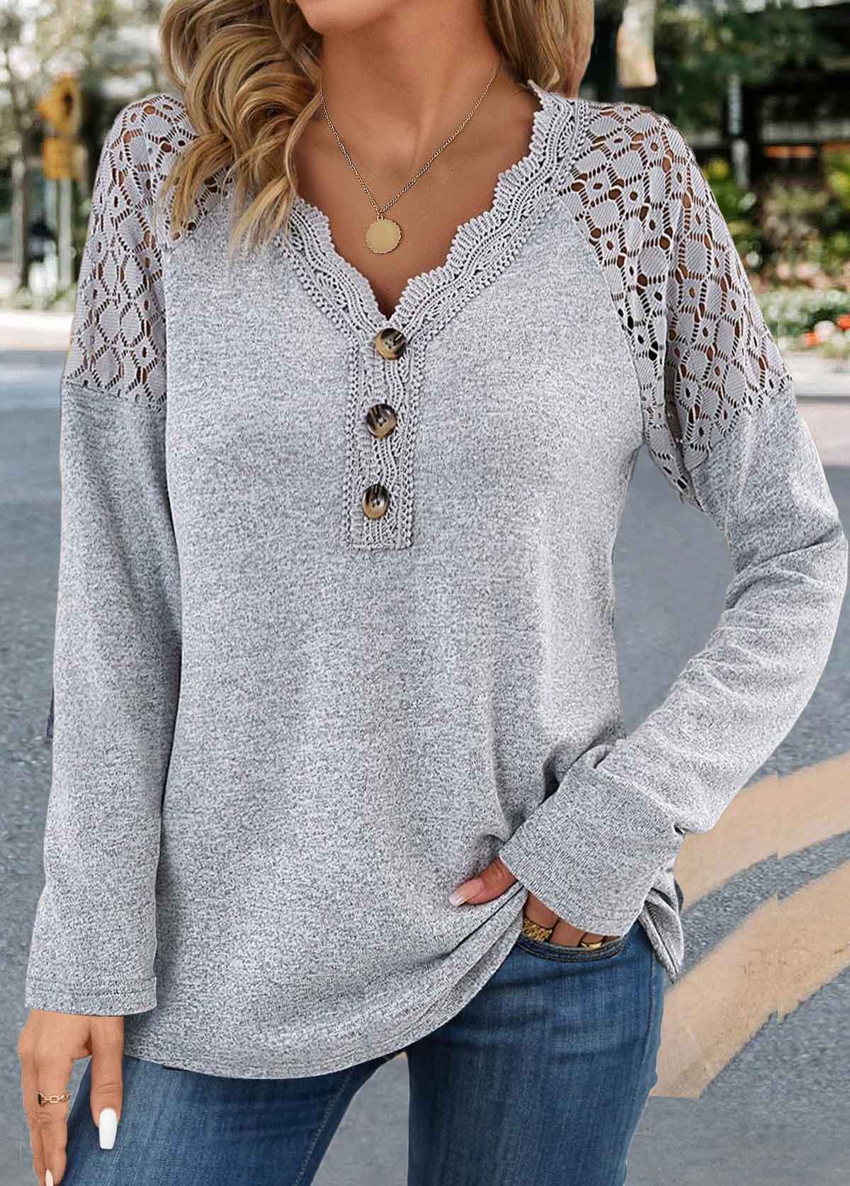 Grey Lace Long Sleeve V Neck T Shirt