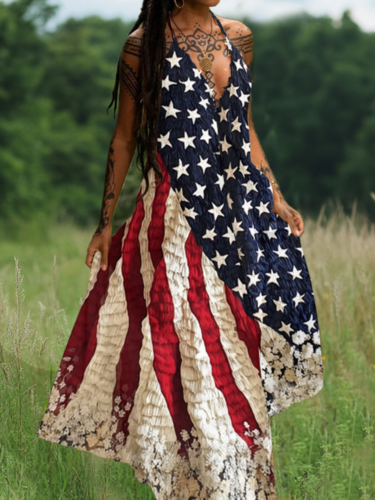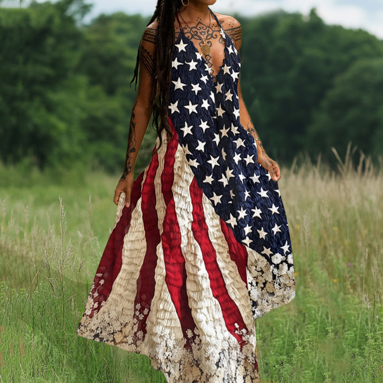 Independence Day Flag Floral Art Inspired Patchwork Maxi Dress