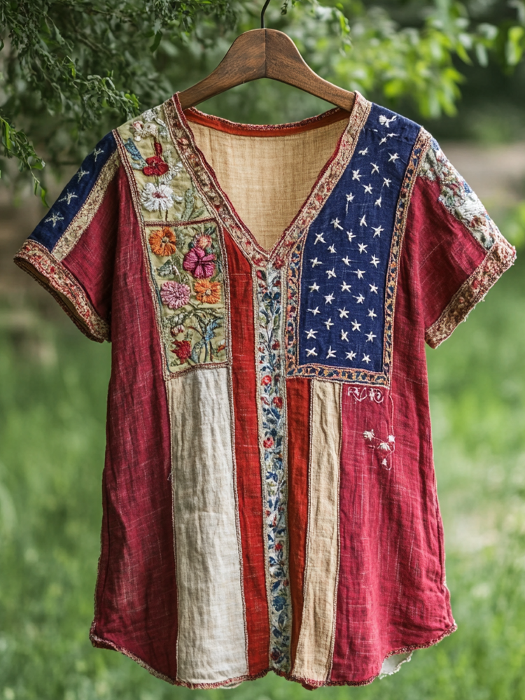 Independence Day Flag Flower Patchwork Print V Neck T-shirt