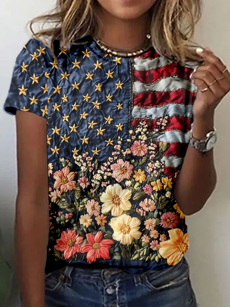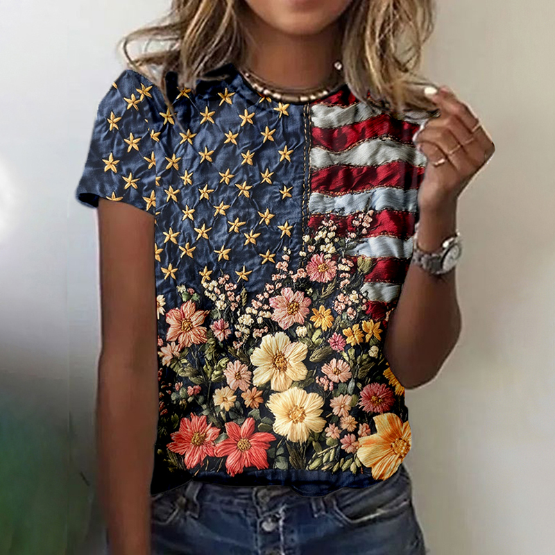 Independence Day Flag & Flowers Embroidered Cozy T Shirt