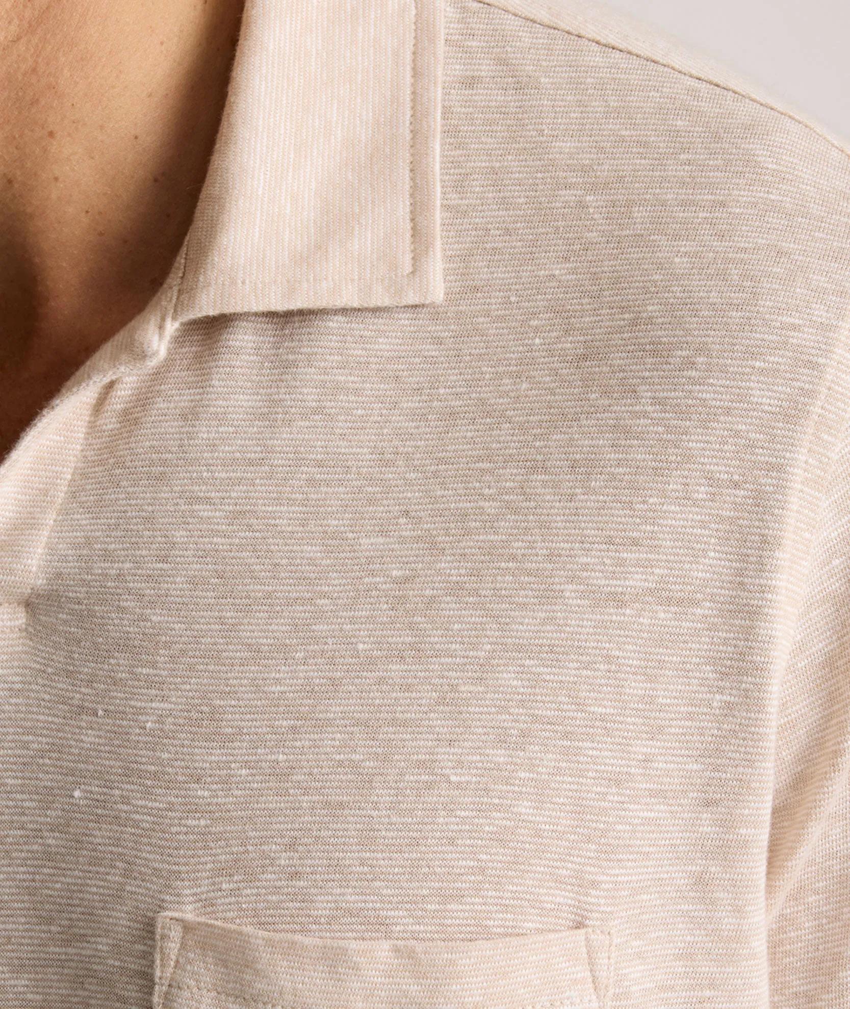 Add a dose of cool to your sunny-day wardrobe with this retro-inspired polo. Made from an unbelievably soft blend of classic cotton and lightweight linen, this style has a no-fuss, buttonless collar that’s timeless and effortless to wear. Plus, its subtle stripe and perfect untucked length make it easy to look sharp at a moment’s notice. Pair it with our 5-Pocket Chino Pants for any of your upcoming warm-weather occasions.