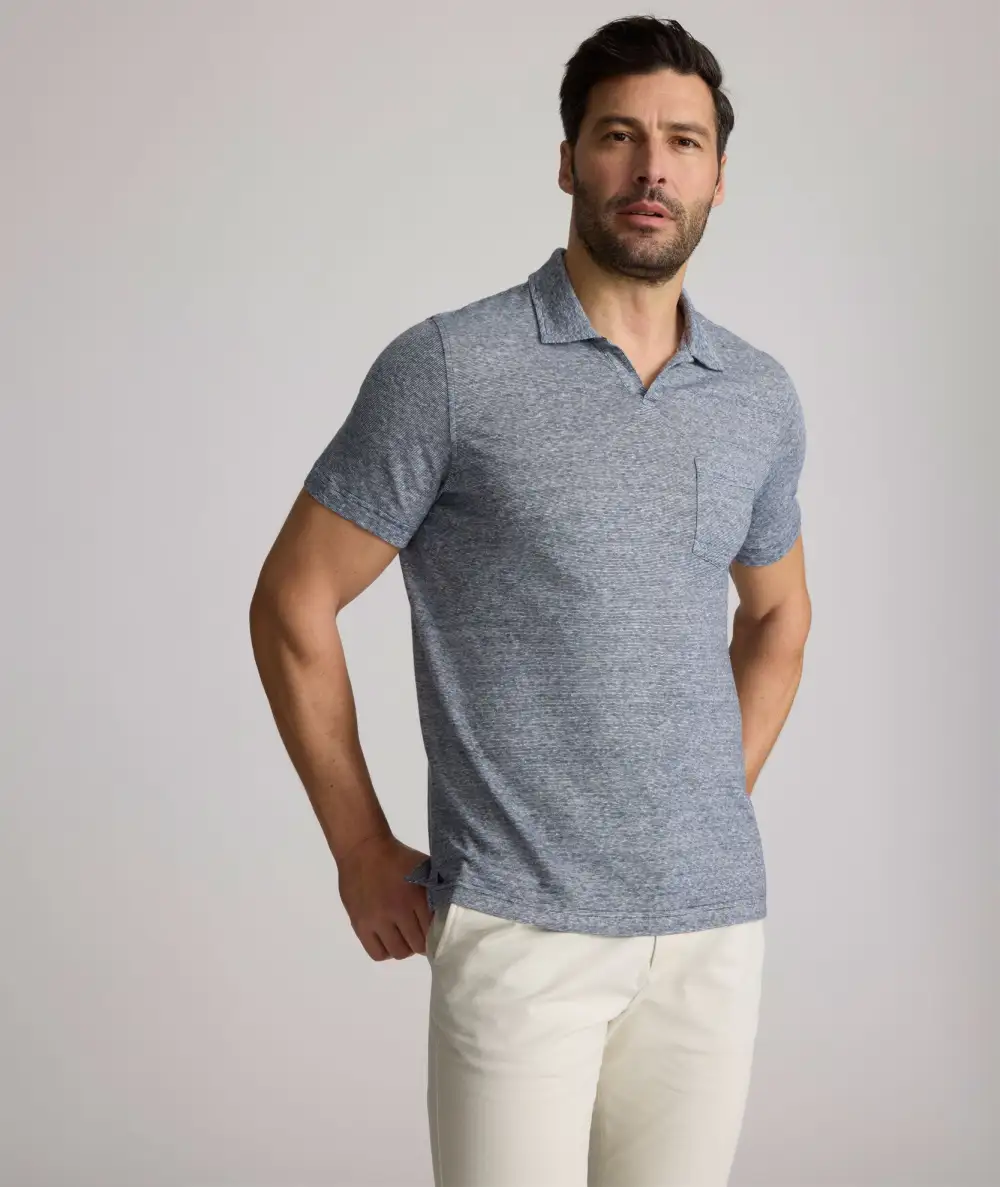 Add a dose of cool to your sunny-day wardrobe with this retro-inspired polo. Made from an unbelievably soft blend of classic cotton and lightweight linen, this style has a no-fuss, buttonless collar that’s timeless and effortless to wear. Plus, its subtle stripe and perfect untucked length make it easy to look sharp at a moment’s notice. Pair it with our 5-Pocket Chino Pants for any of your upcoming warm-weather occasions.