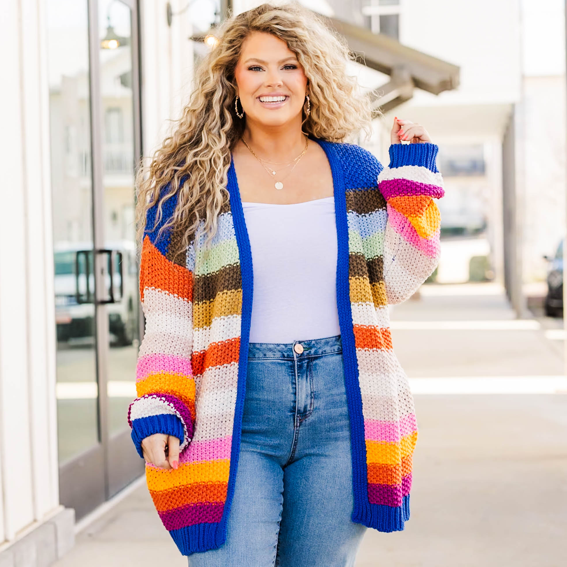 We simply adore this sassy cardi! It features a bold, multi-color stripe pattern that is both eye-catching and on-trend for the season! This versatile piece serves as the perfect layering option, adding a pop of color and style to any outfit!