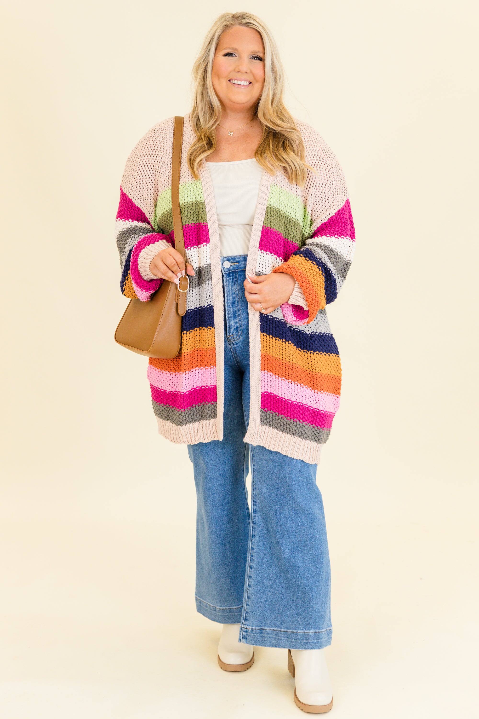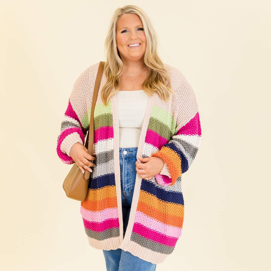We simply adore this sassy cardi! It features a nude-color stripe pattern that is both eye-catching and on-trend for the season! This versatile piece serves as the perfect layering option, adding a pop of color and style to any outfit!