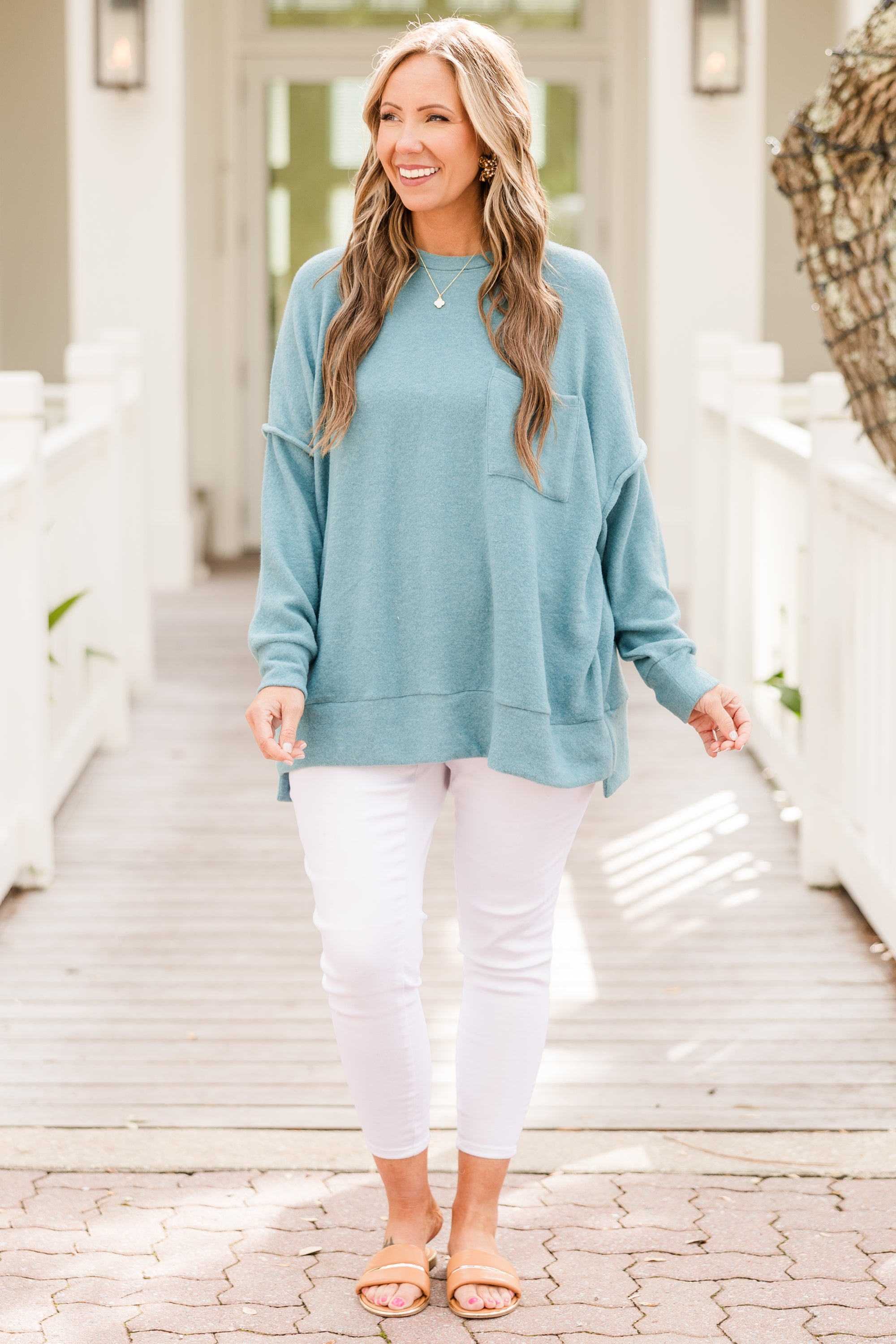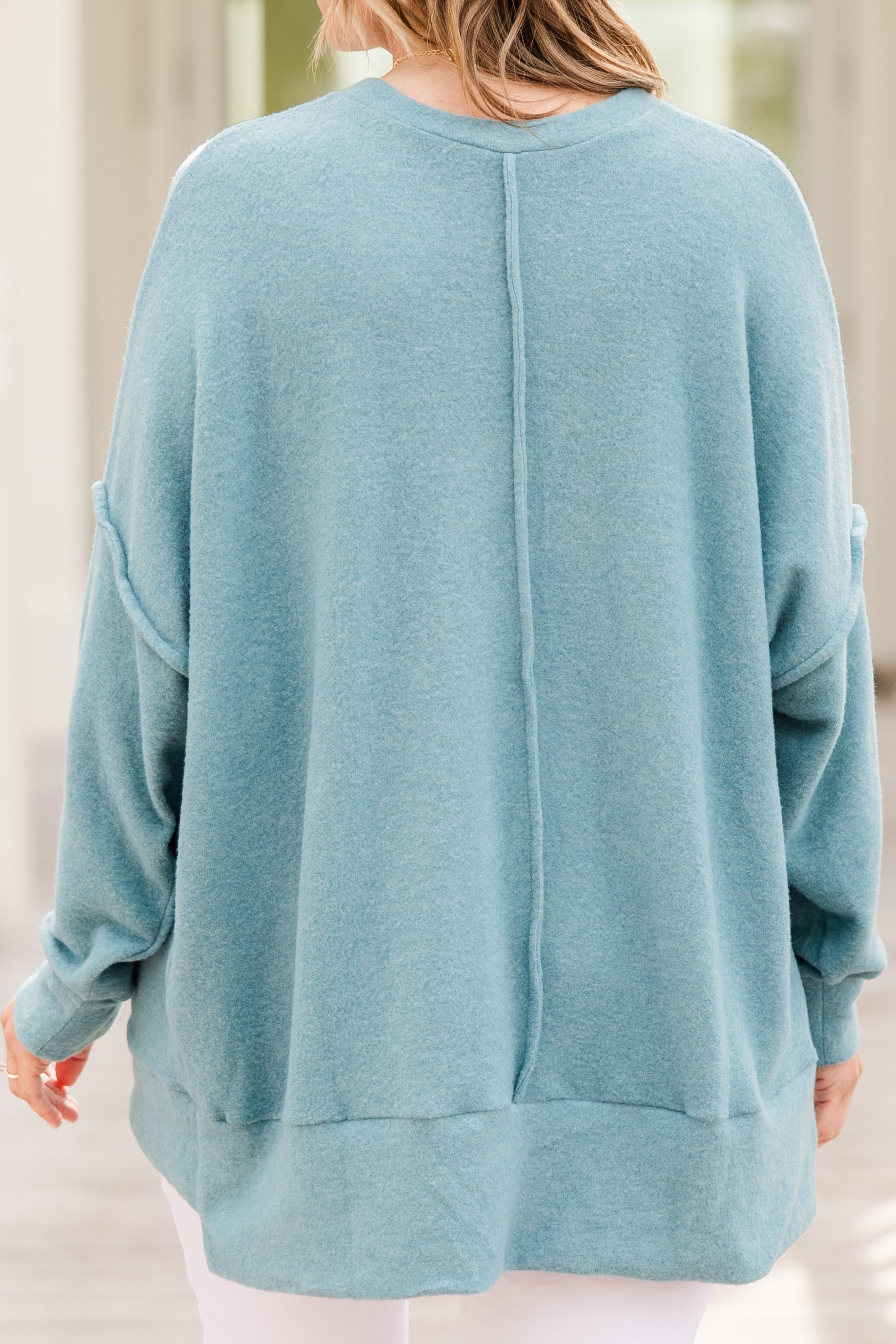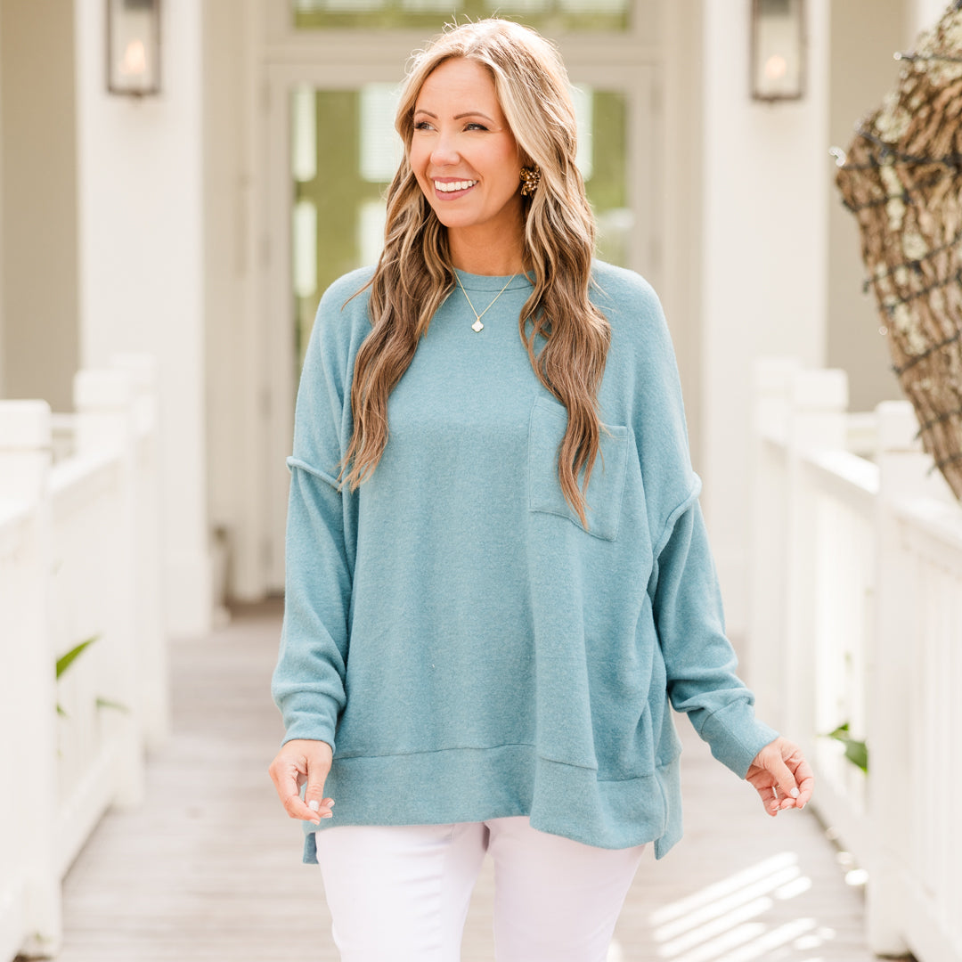 Stay cozy and comfortable with the Just Take A Break Sweater in dusty teal! Made from brushed knit fabric, this relaxed fit sweater features an exposed seam design and a banded high low hem! Complete with a round neckline and front pocket detail, it's the perfect addition to your casual wardrobe! Go ahead, take a break in style!