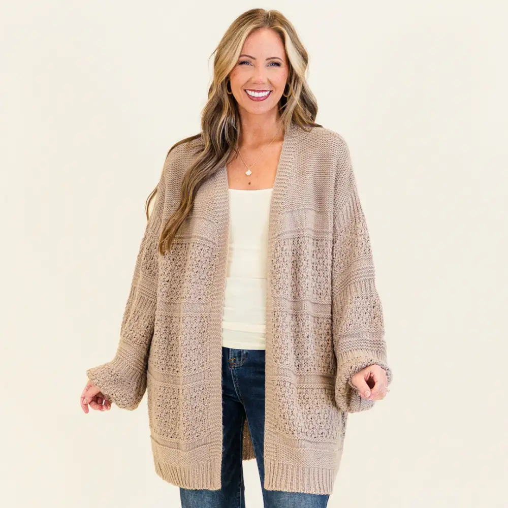Stay cozy and stylish with our Keepin' Cozy Cardigan in taupe! Featuring an open front and cable knit design, this cardigan adds a touch of warmth and texture to any outfit! With a relaxed drop shoulder and classic color, it's a staple piece for any wardrobe!