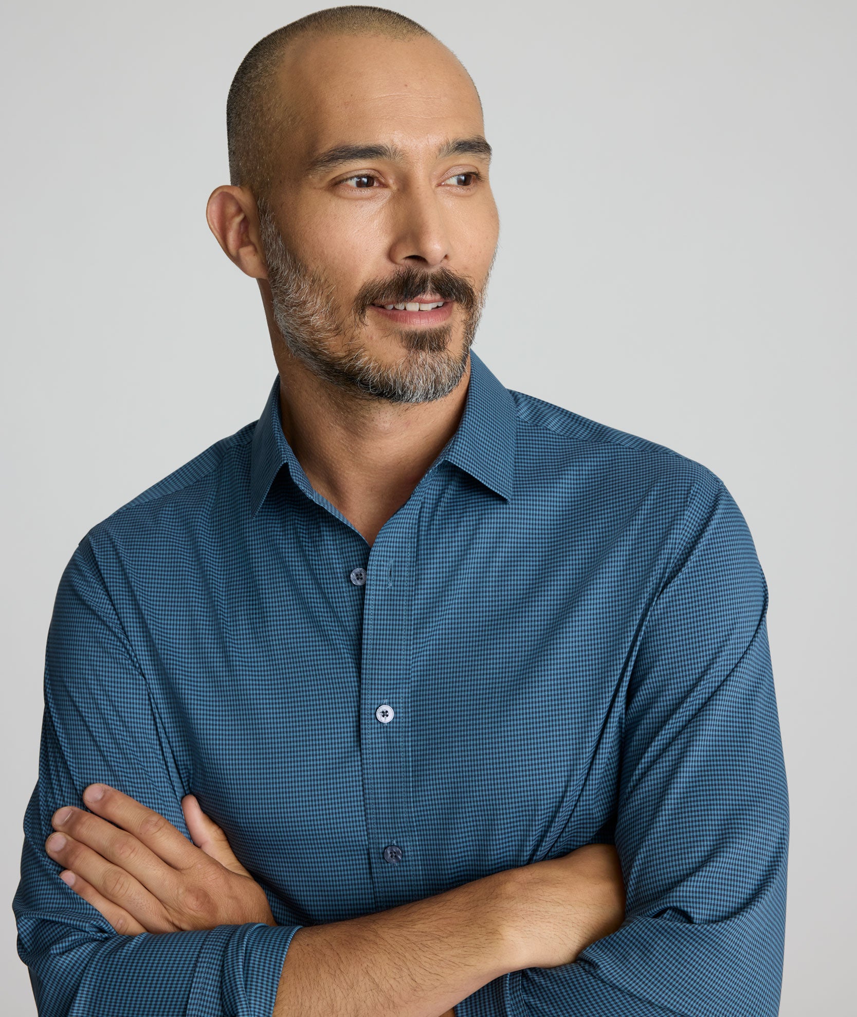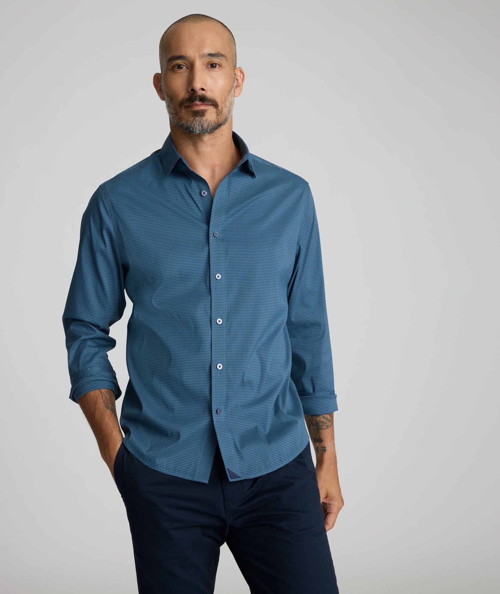 Finally, a shirt that combines the crisp feel of Wrinkle-Free cotton with the power of Performance. It’s the best of both worlds—breathable, stretchy, and sweat wicking, all while keeping that polished look you love. Even better? It’s machine washable, so you can skip the dry cleaner. We designed this polished gingham pattern to easily pair with a sharp Italian sport coat or stand out on its own. And to top it off, we infused it with BRRR° micro-mineral cooling technology, keeping you comfortable and cool all day long.