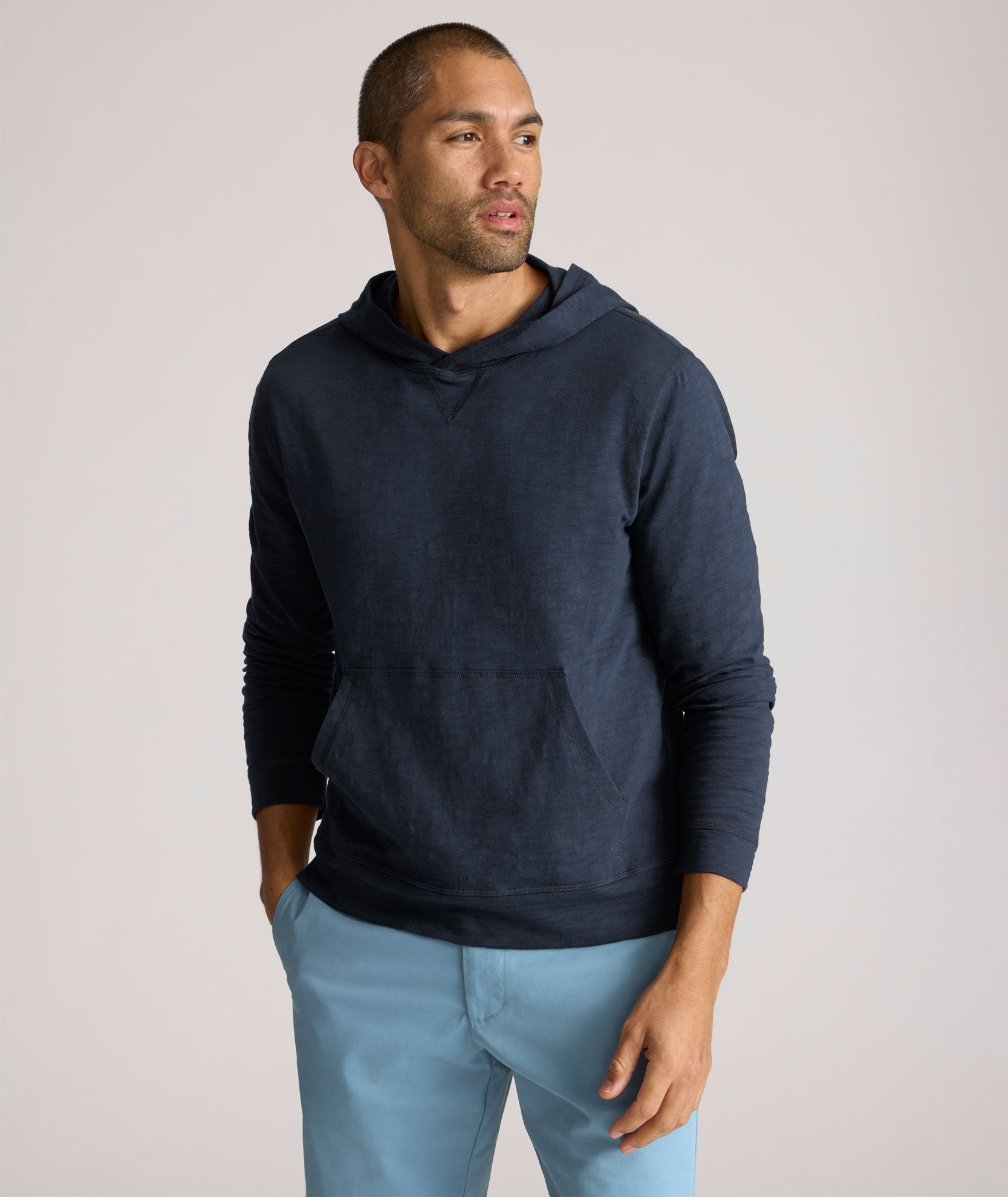 A soft slub hoodie is just the right call when the weather gets breezy. Ours is made from comfortable 100% cotton with a fine texture for a warm yet breathable feel—and it comes with an easy