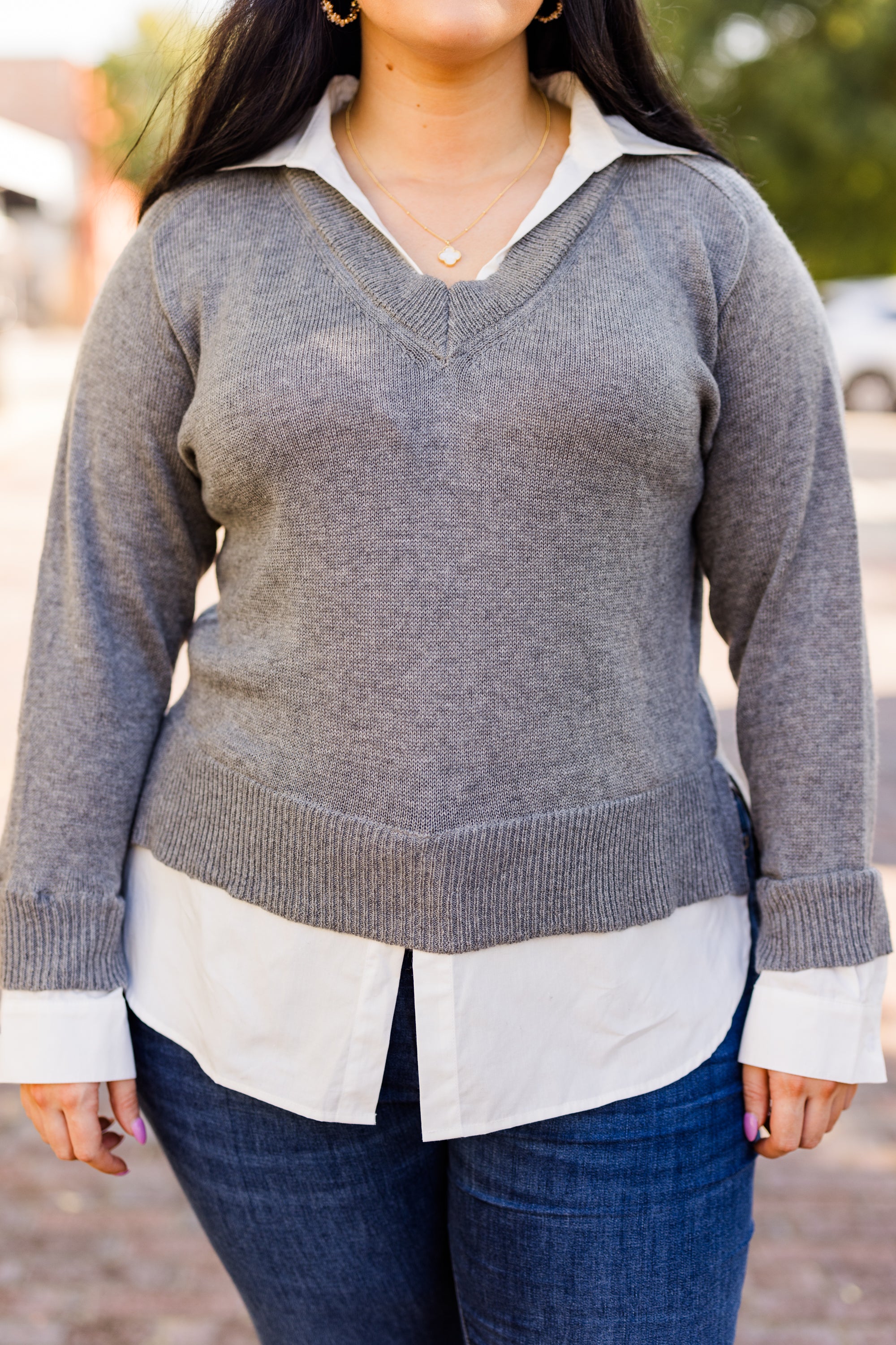 The Legally Mine Sweater in charcoal is the perfect addition to any wardrobe! Its grey v-neck design is not only trendy and stylish, but also features a unique sewn white button up contrast that gives the appearance of layering without the hassle! Stay warm and fashionable with this must-have sweater!