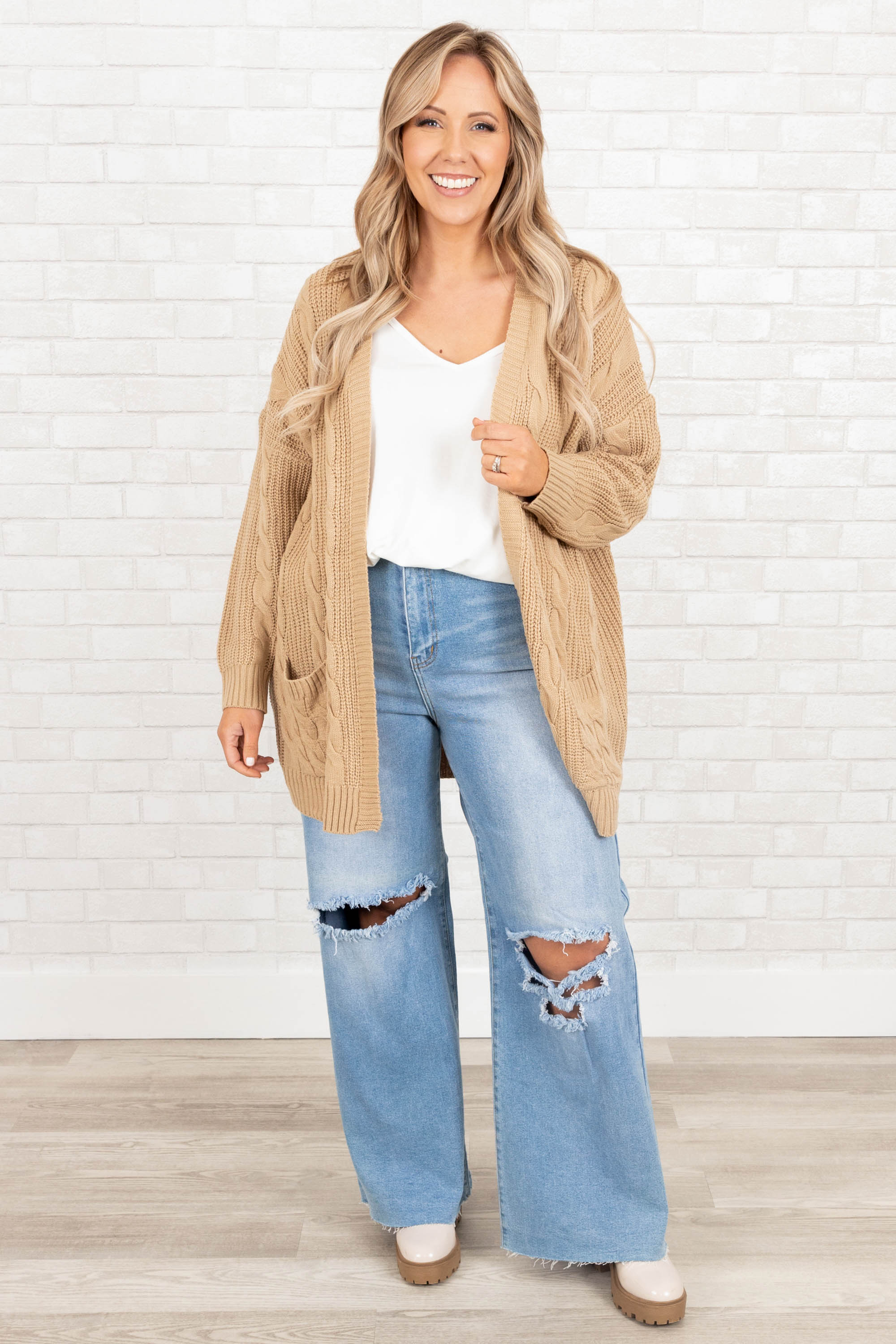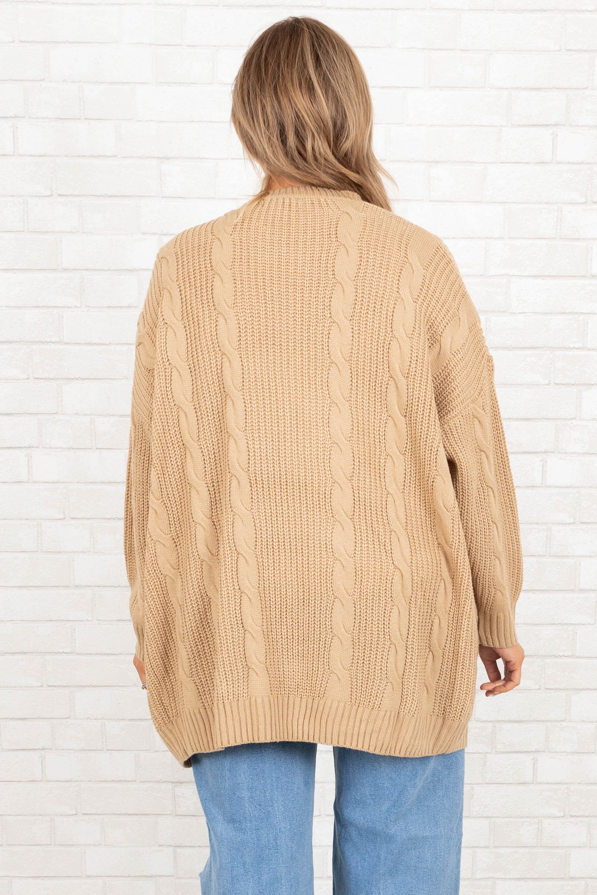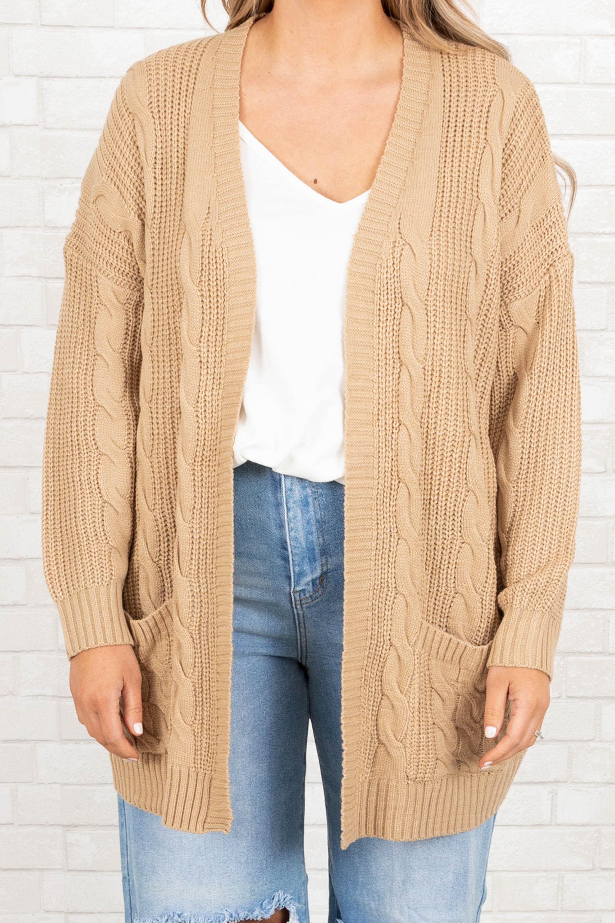 Grab this beautiful cardi before it's gone! It has a neutral brown color with a knitted design that is perfect for the season! The stretchy, figure flattering fit is great for layering over all of your fave outfits! Style this cardigan with a cute top and distressed denim for a casual chic look!