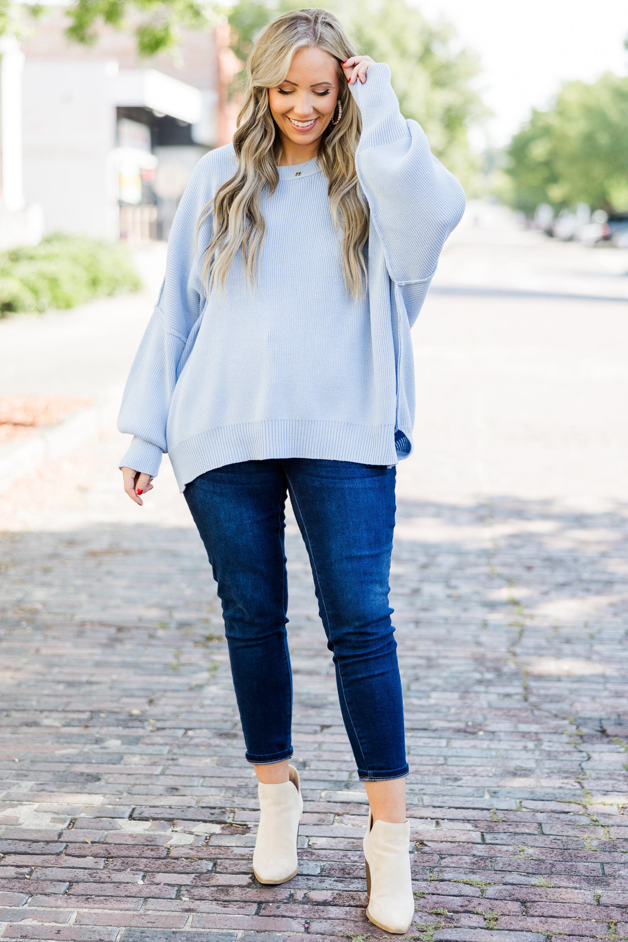 This top is truly magically perfect! The light blue color and super comfy material is just that you need in your new favorite sweater! The stretchy, figure flattering fit is great for all day wear! The bubble sleeves are so chic! Pair this sweater with some distressed skinnies and sandals or wedges for a classic chic look!