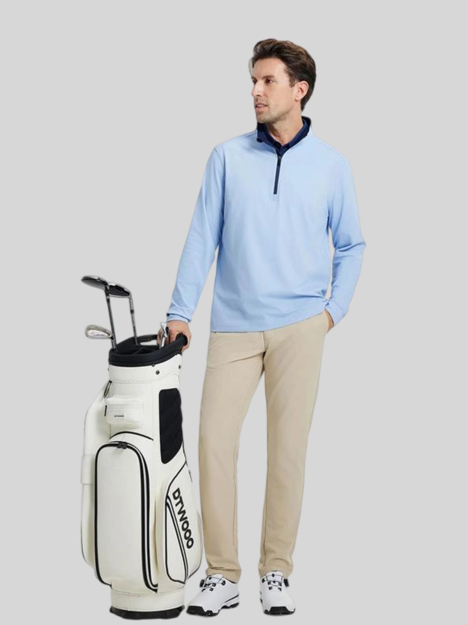 Fabric: Moisture-wicking, 4-way stretch fabric—lightweight, durable, breathable. Keeps dry and comfortable during golf, workouts.