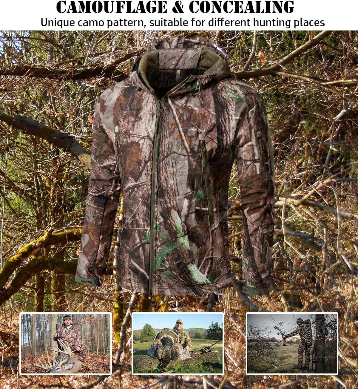 The softshell jacket is made of soft shell fabric which is waterproof and wind breaker. It keeps you dry in the rain and snow, block all wind and keep the cold air out. The medium weight fleece lining keeps you pretty warm in winter. It has several camouflage colors and solid color to match the season and situation you enter.