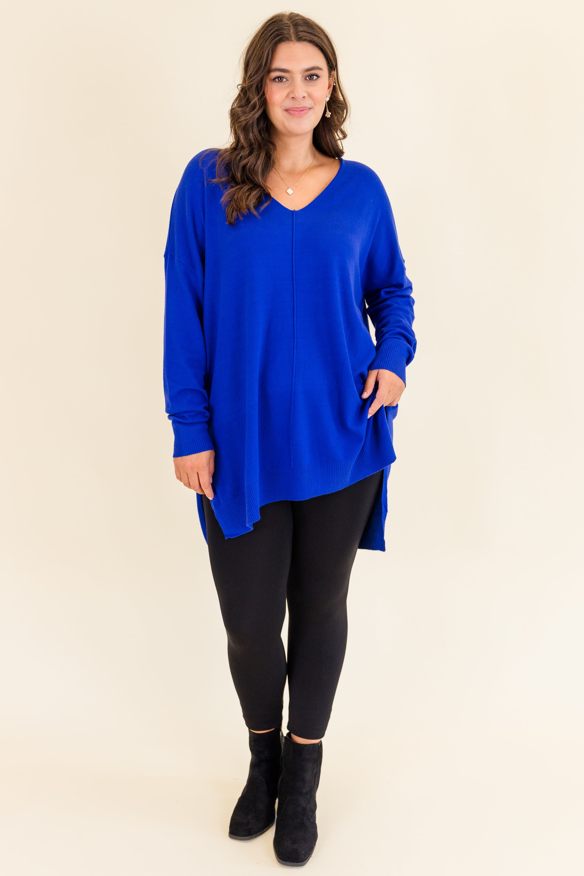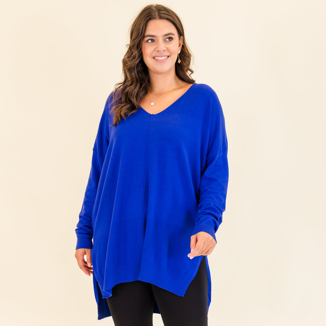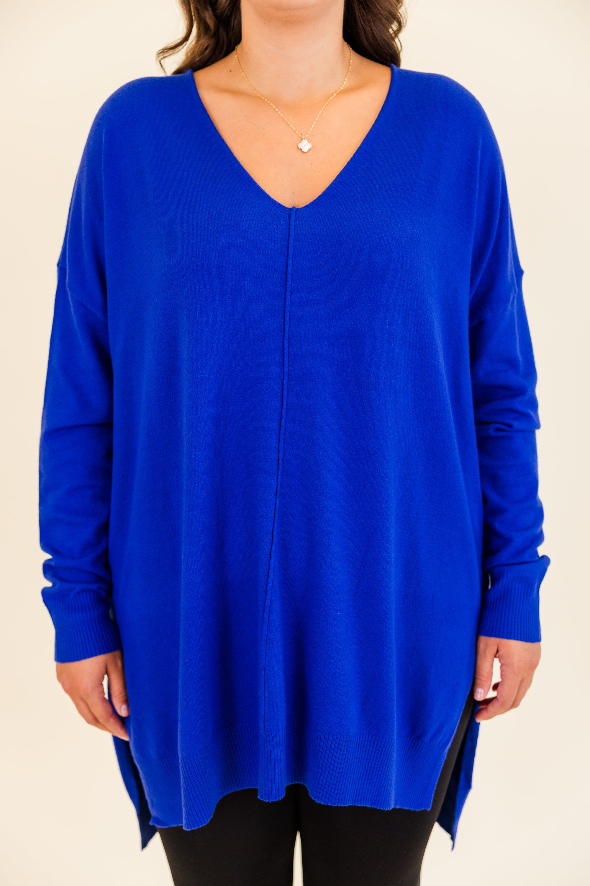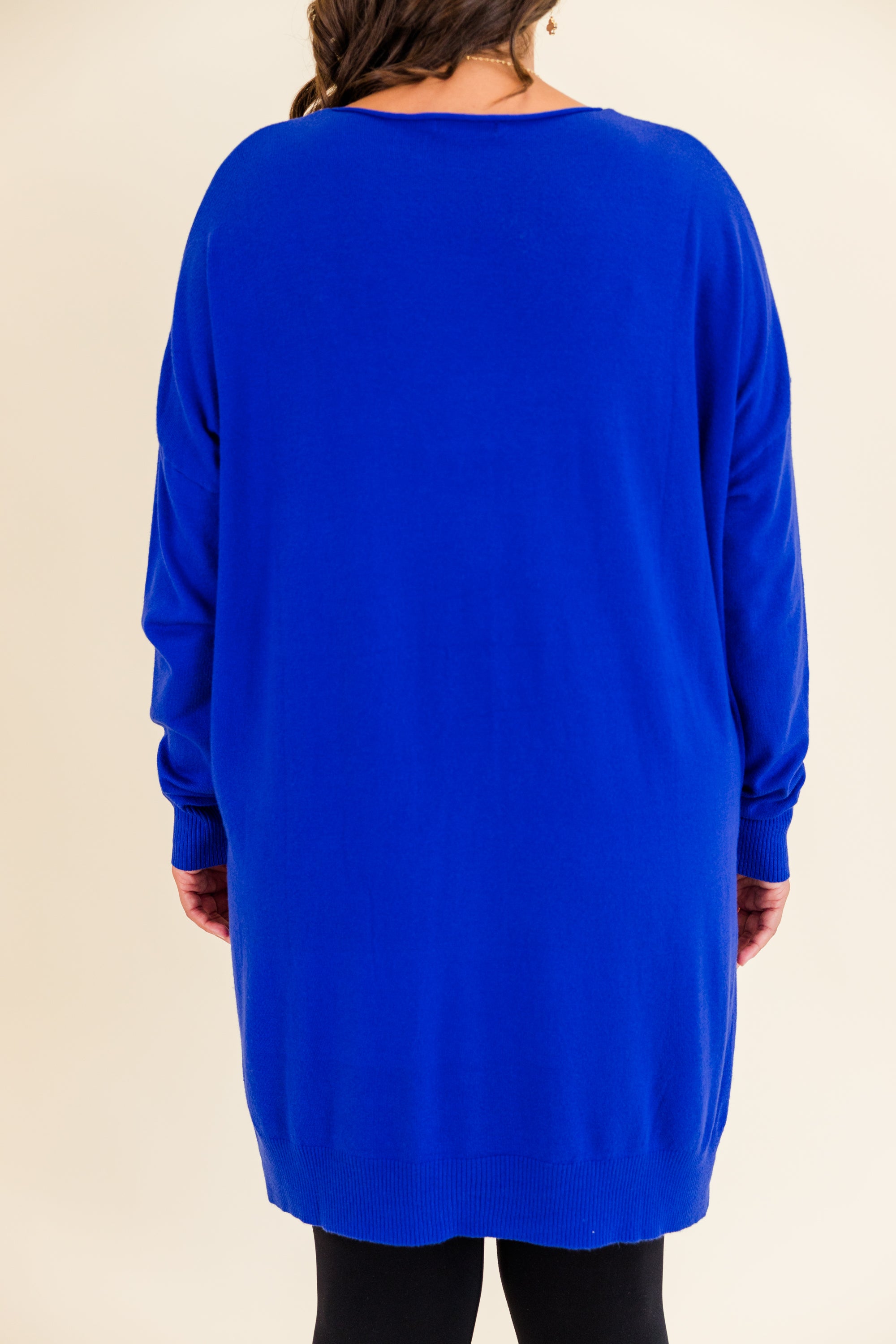 In this top, you'll never miss last year's wardrobe! This sweater has a chic cobalt blue color you can dress up or down and style with everything in your closet! It's comfortable for all day wear, has a figure-flattering fit, and can be layered with your favorite outerwear! Simply, style this sweater with leggings and booties for an effortlessly chic look!