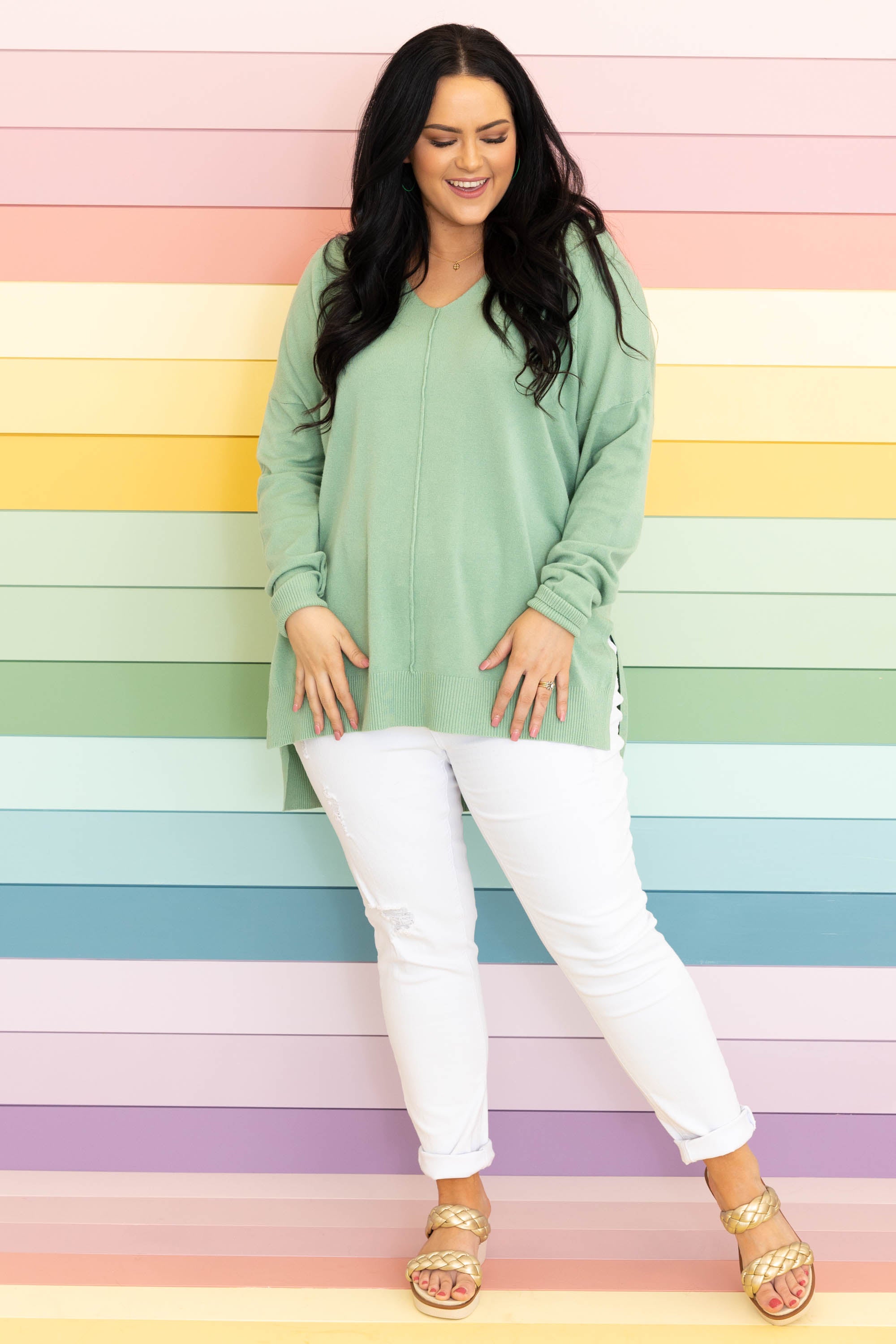 In this top, you'll never miss last year's wardrobe! This sweater has a chic light jade color you can dress up or down and style with everything in your closet! It's comfortable for all day wear, has a figure-flattering fit, and can be layered with your favorite outerwear! Simply, style this sweater with skinnies or shorts for an effortlessly chic look!