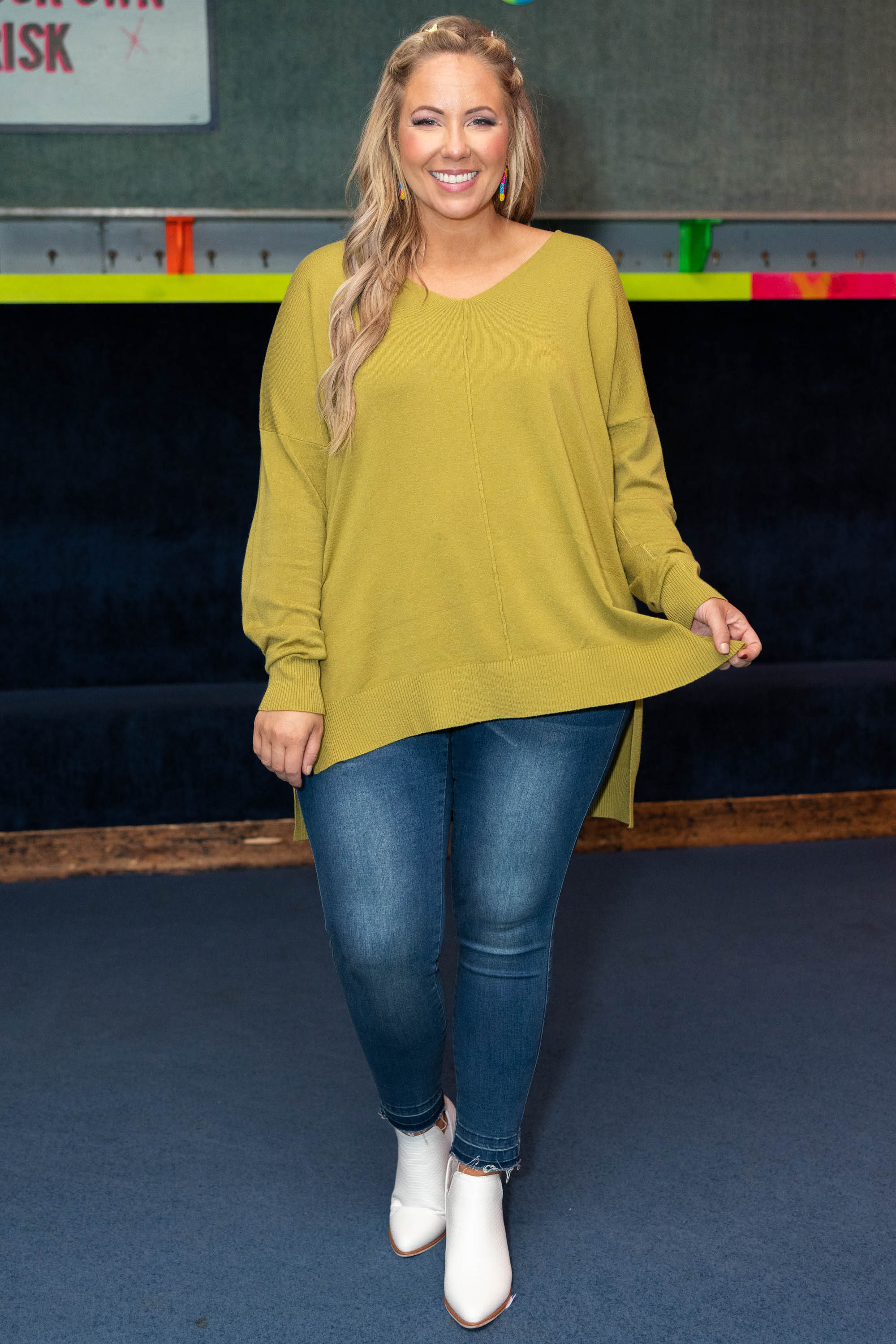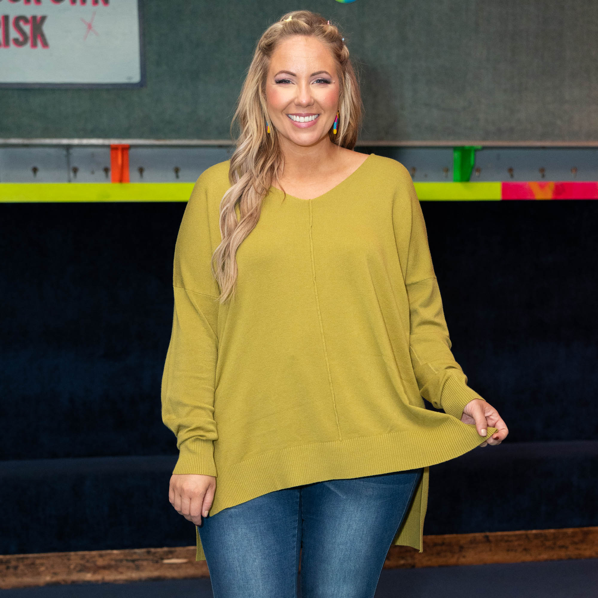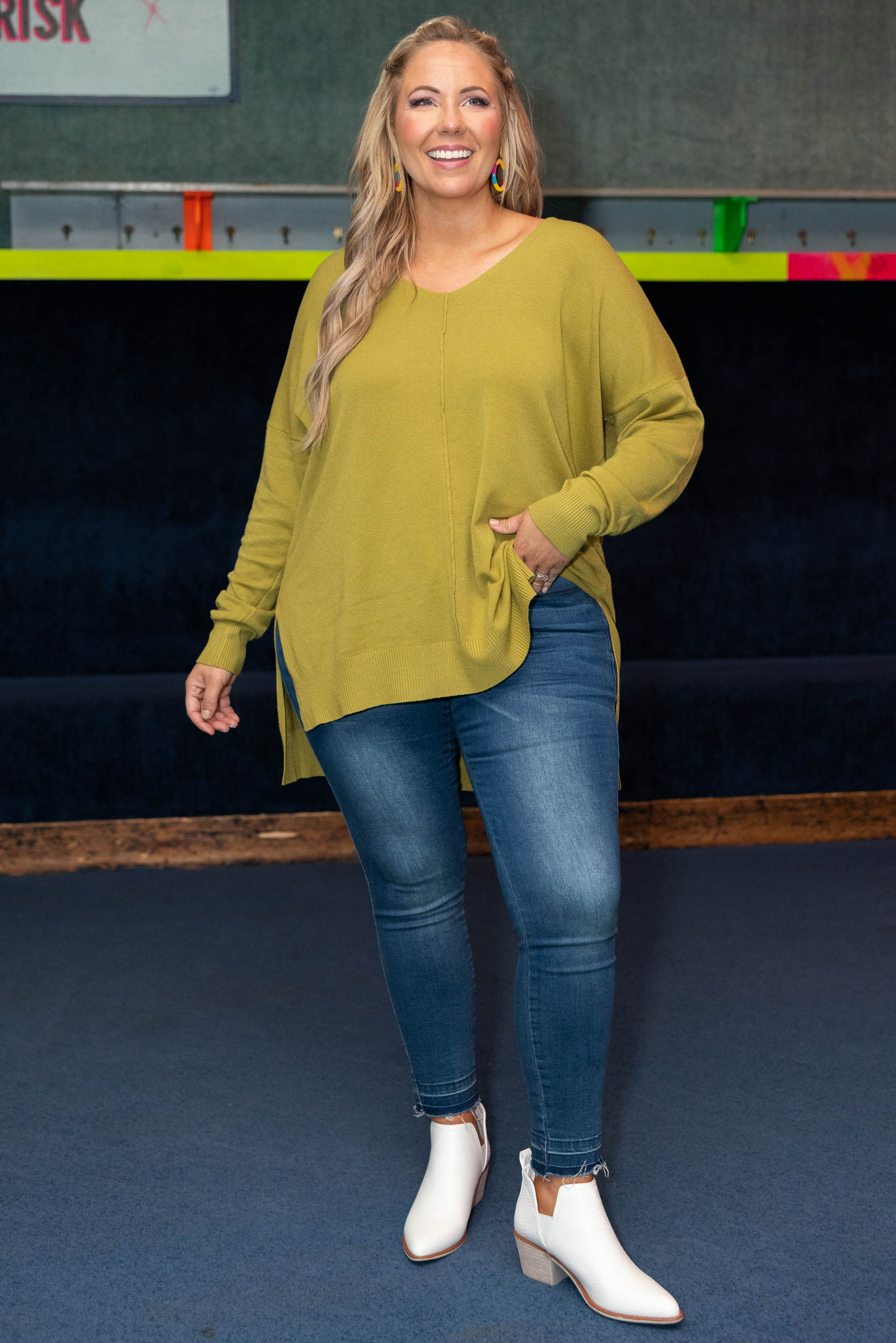 In this top, you'll never miss last year's wardrobe! This sweater has a chic olive-mustard color you can dress up or down and style with everything in your closet! It's comfortable for all day wear, has a figure-flattering fit, and can be layered with your favorite outerwear! Simply, style this sweater with skinnies and boots for an effortlessly chic look!
