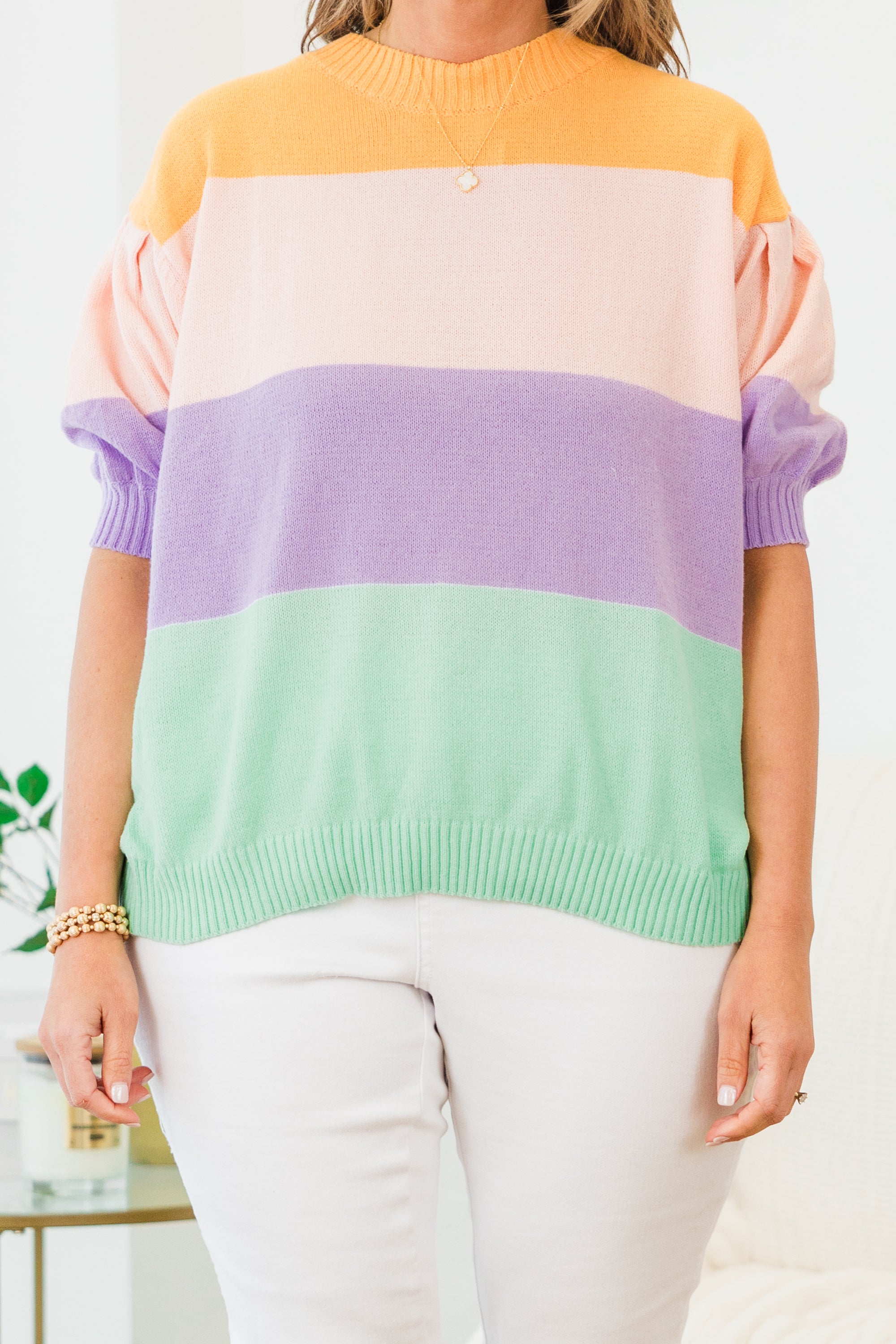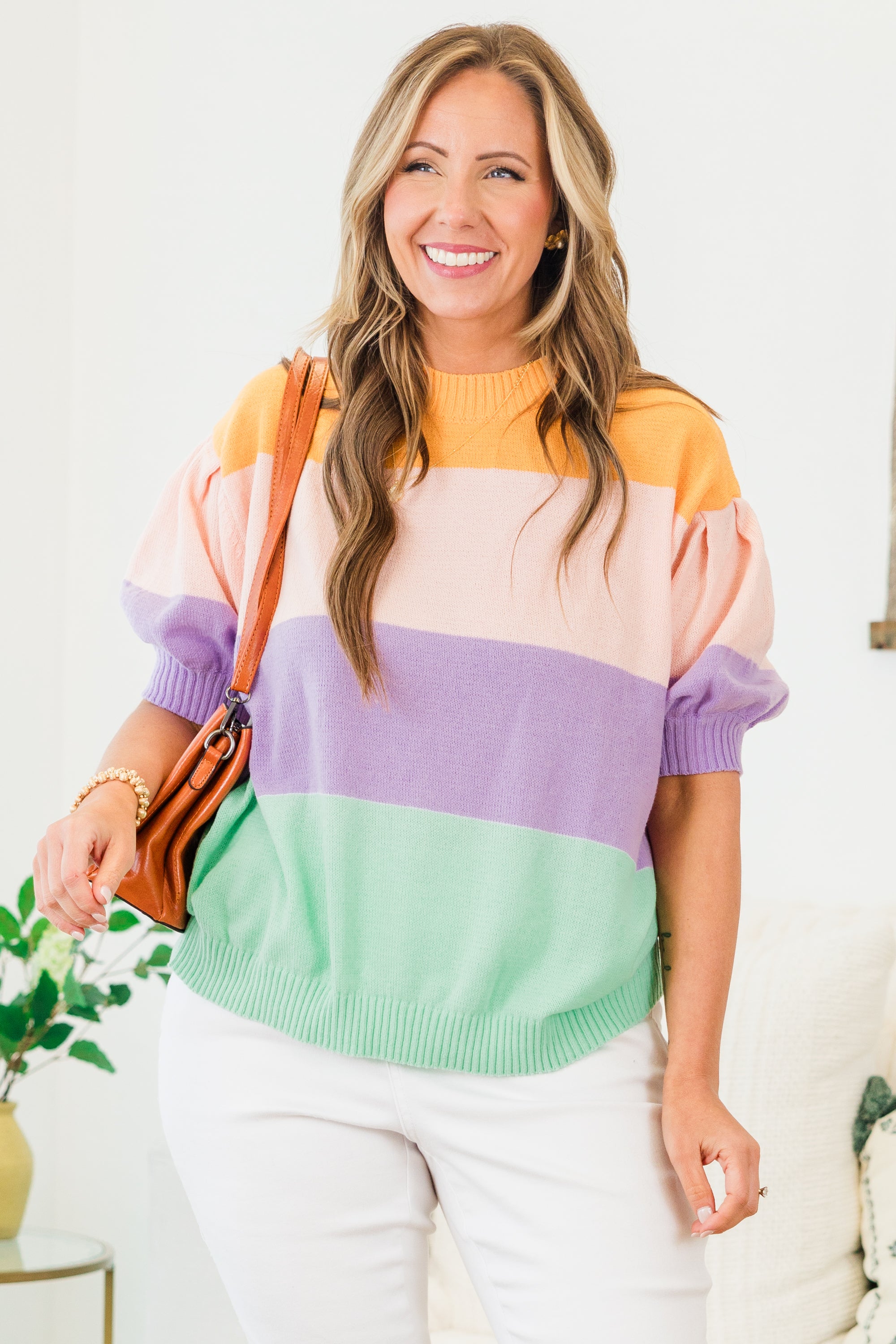 The Morning Air Sweater is the perfect addition to your wardrobe! Its color block knit design adds a playful yet sophisticated touch to any outfit! The banded hem and puff sleeves with ribbed cuffs provide a comfortable and stylish fit! Elevate your look with this must-have sweater!