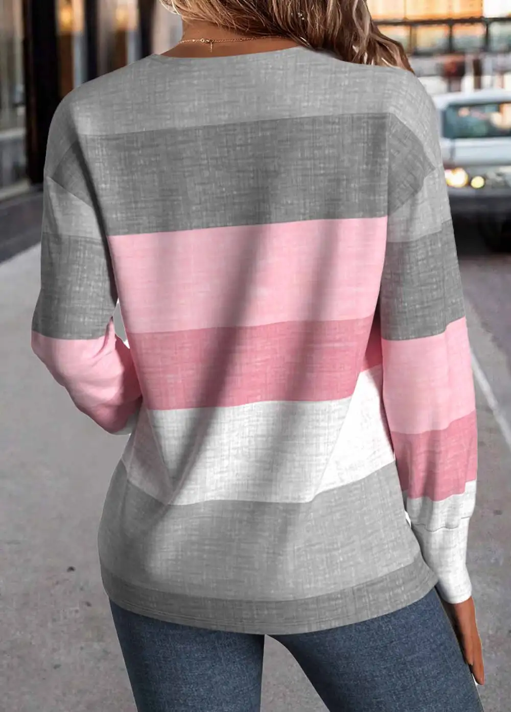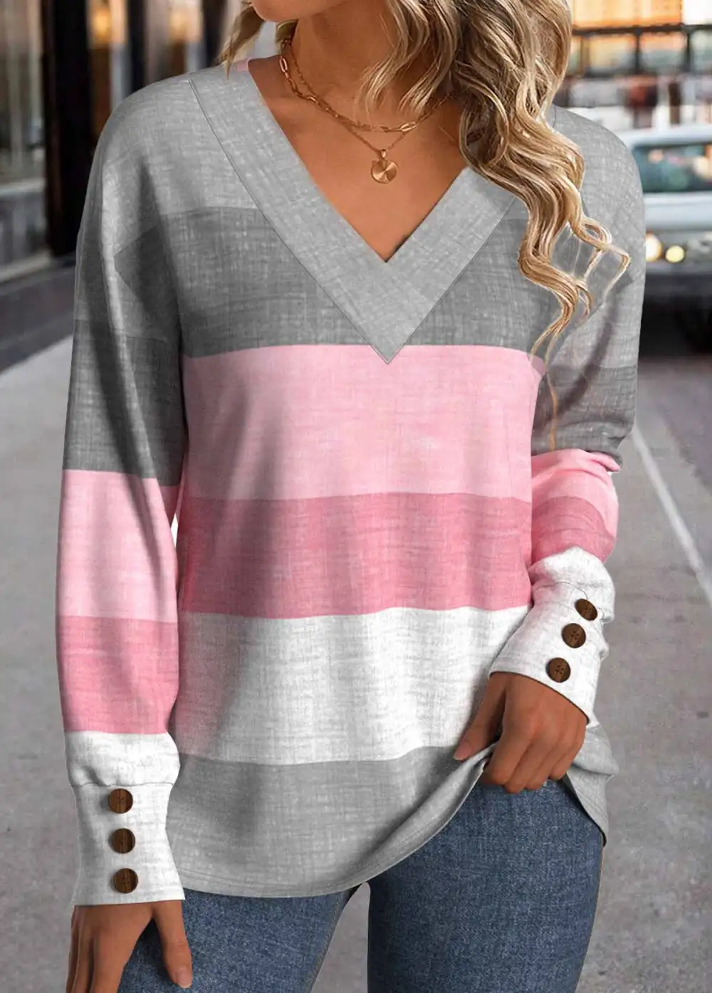 Multi Color Button Geometric Print Long Sleeve T Shirt