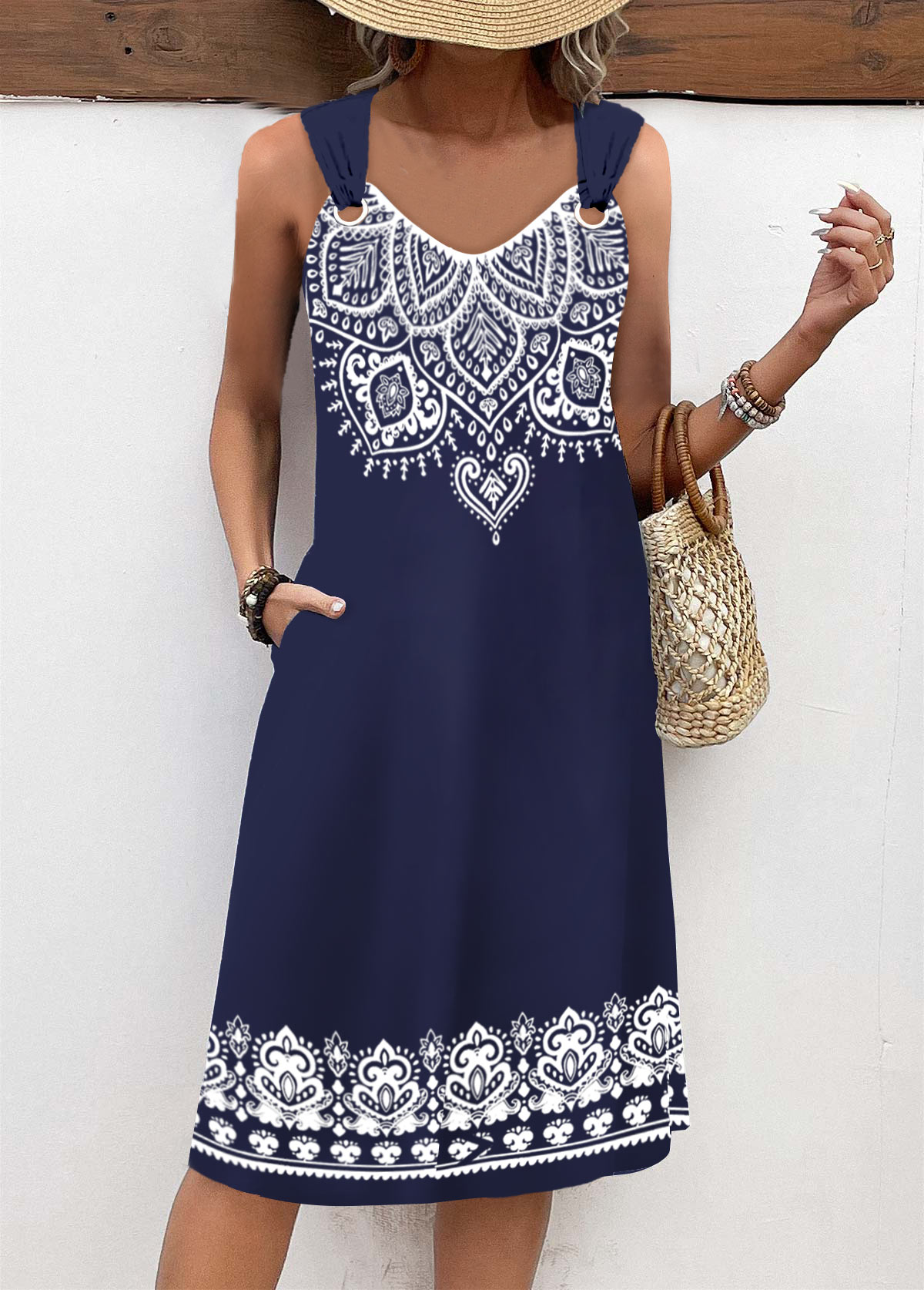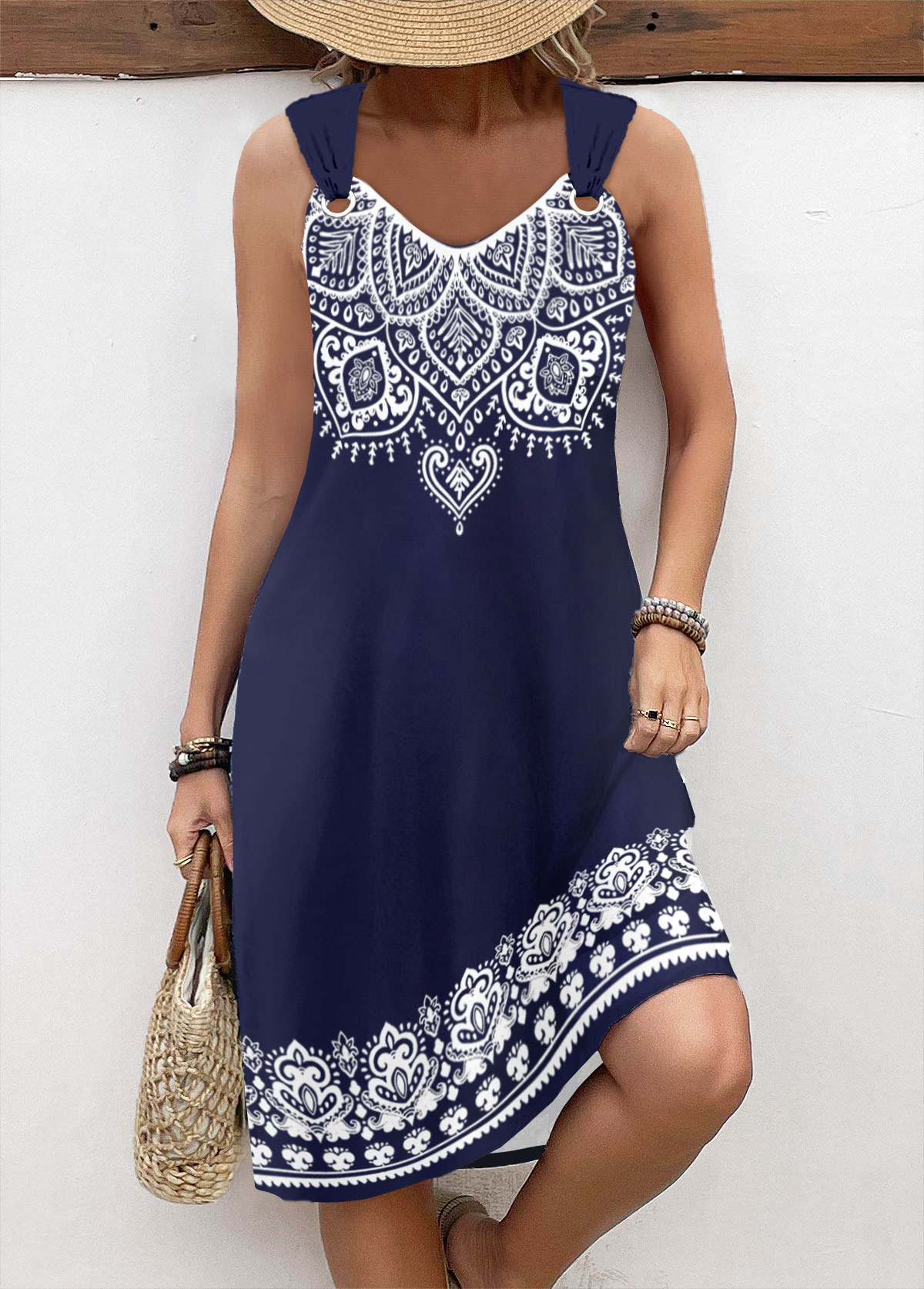 Navy Breathable Tribal Print A Line Sleeveless Dress