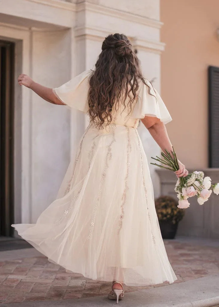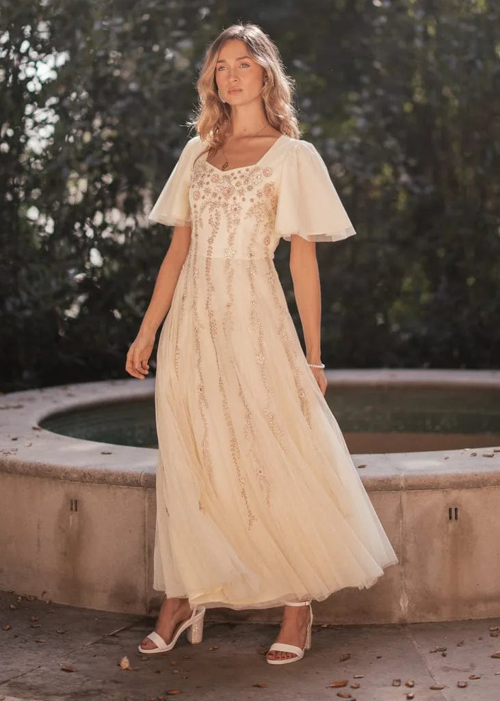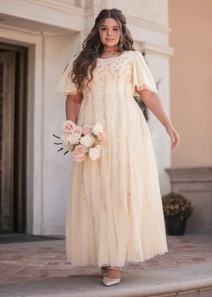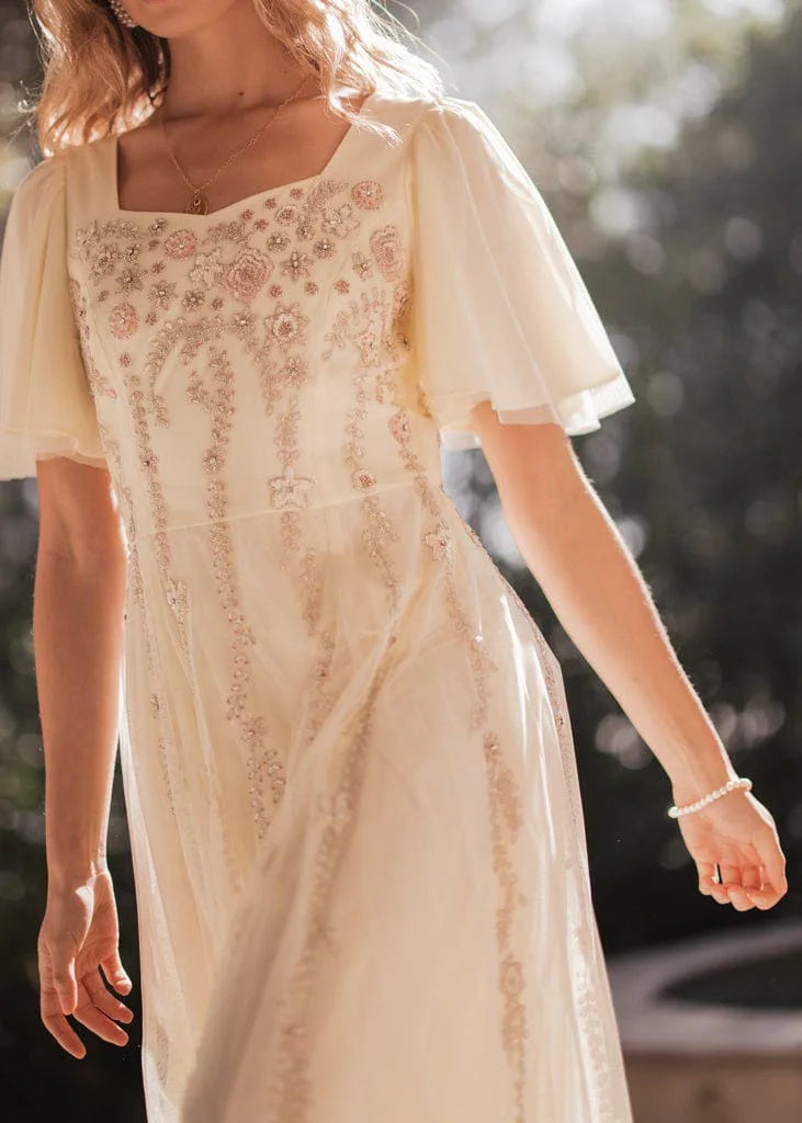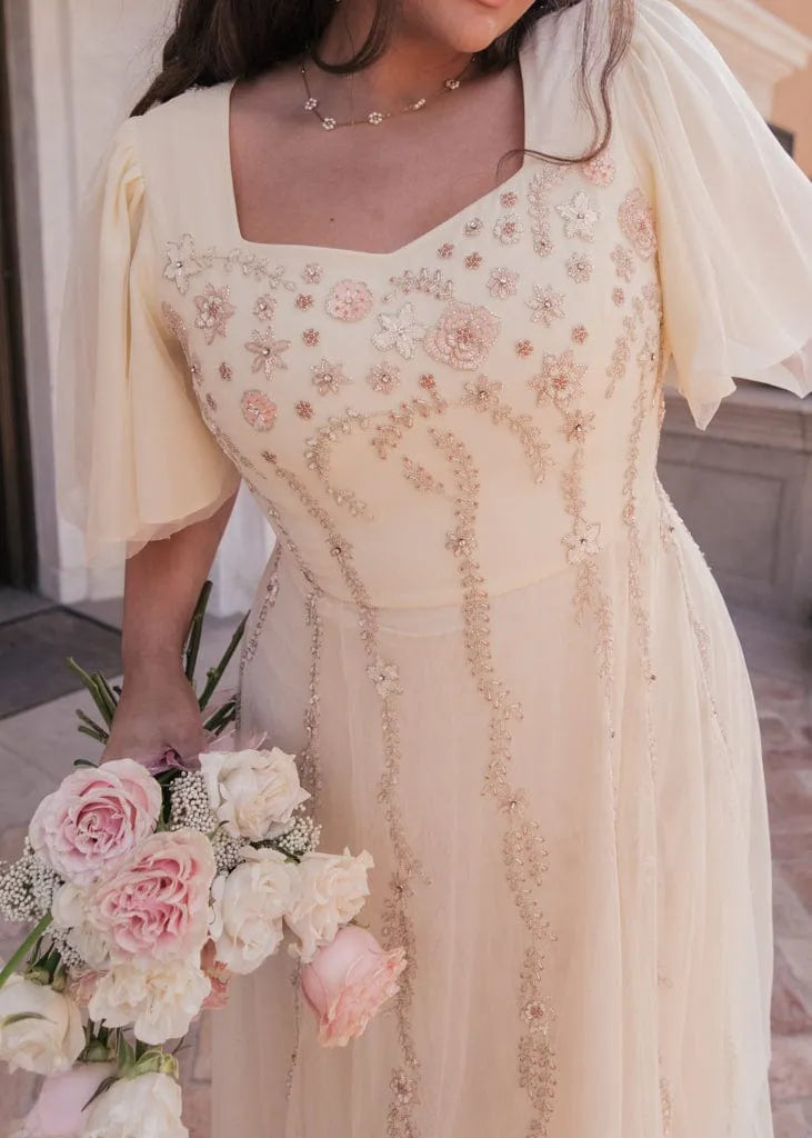 The Neva Dress captures timeless elegance with its soft butter-yellow shade and delicate floral embroidery that flows gracefully along the bodice and skirt. Designed with flutter sleeves and a dreamy, flowing silhouette, it offers a romantic and enchanting look. Ideal for weddings, garden gatherings, or any special occasion, the Neva Dress is a perfect blend of charm and sophistication.