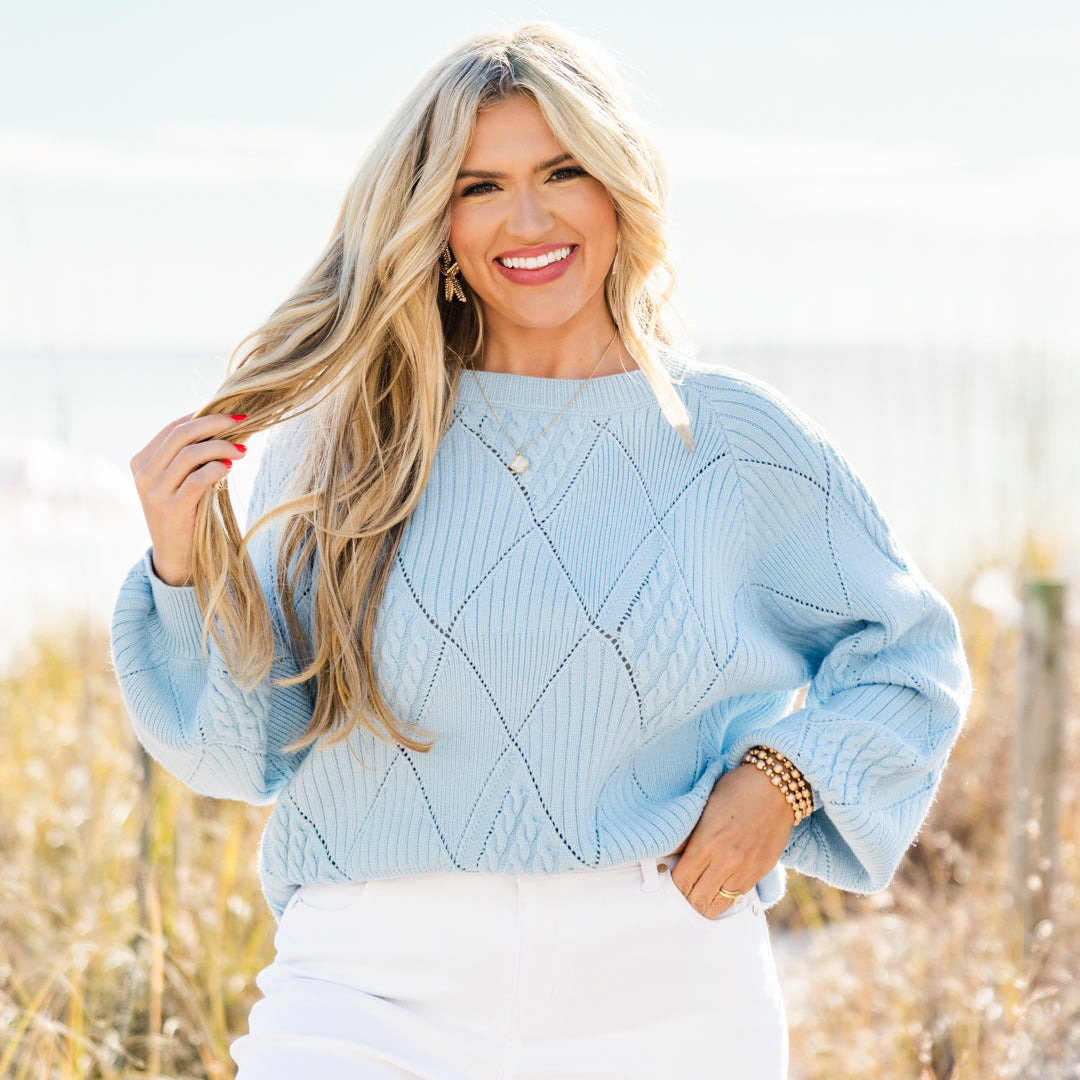 We are so in love with this sweater! It offers a cozy and stylish addition to your wardrobe! With its textured design, this sweater exudes comfort while the pretty blue color adds a touch of femininity! Pair it with white denim and your favorite heels or sandals for a chic look!