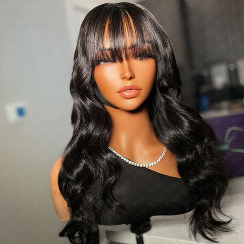 Parting Max 9x6 Glueless Wig #1 Jet Black Body Wave Wig with Bangs Ready to Go