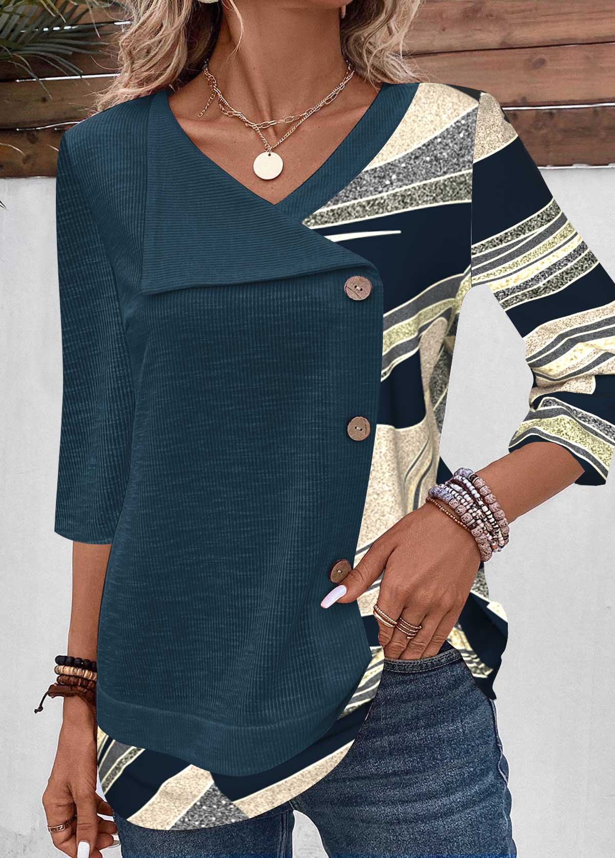 Peacock Blue Patchwork Geometric Print 3/4 Sleeve T Shirt