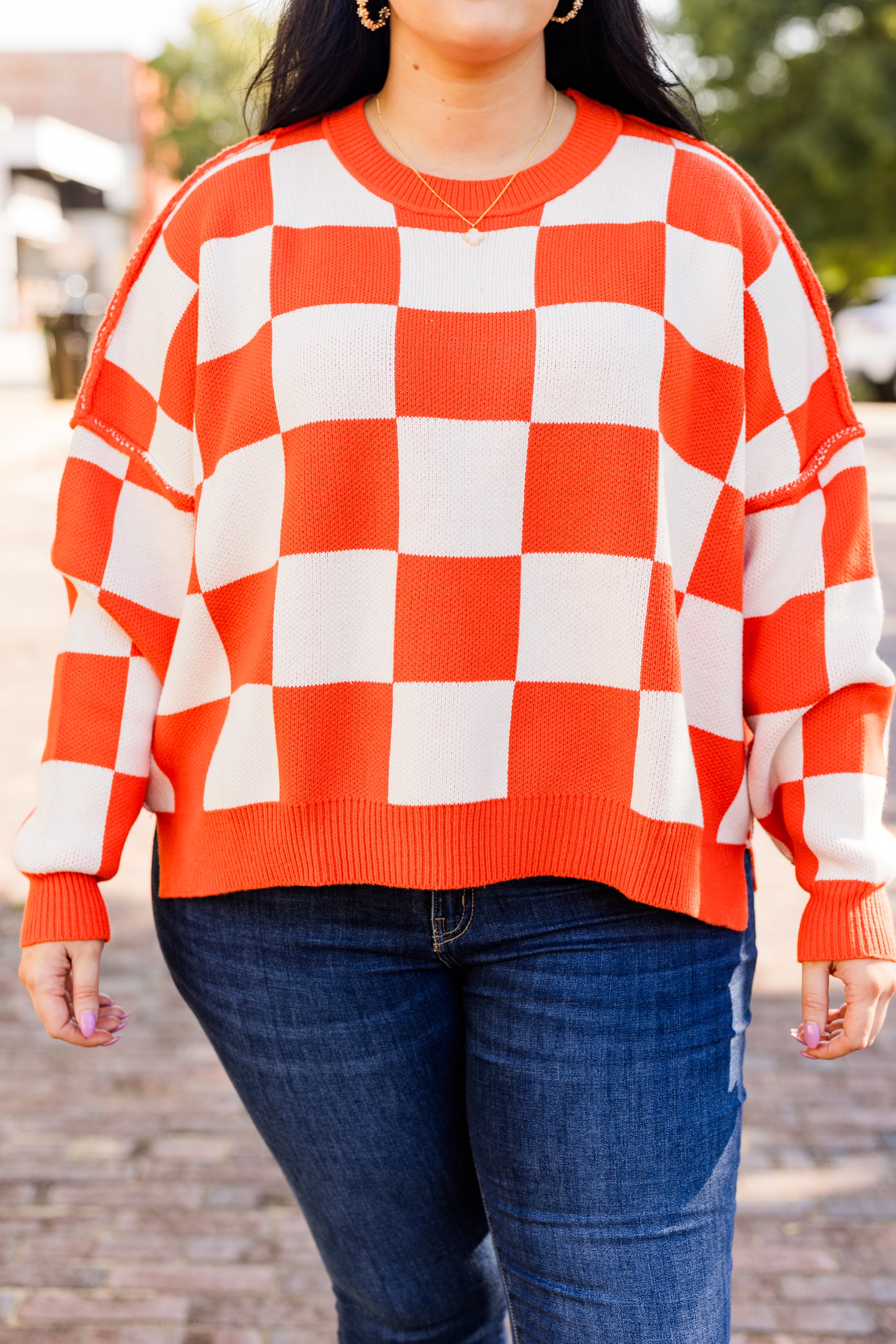 Get ready to cozy up in this Perfect For A Picnic Sweater! With its vibrant orange and cream checkered pattern, you'll be the stylish standout anywhere you go! The crew neckline and reverse stitching detail add an extra touch of charm! Don't miss out on this essential addition to your wardrobe!