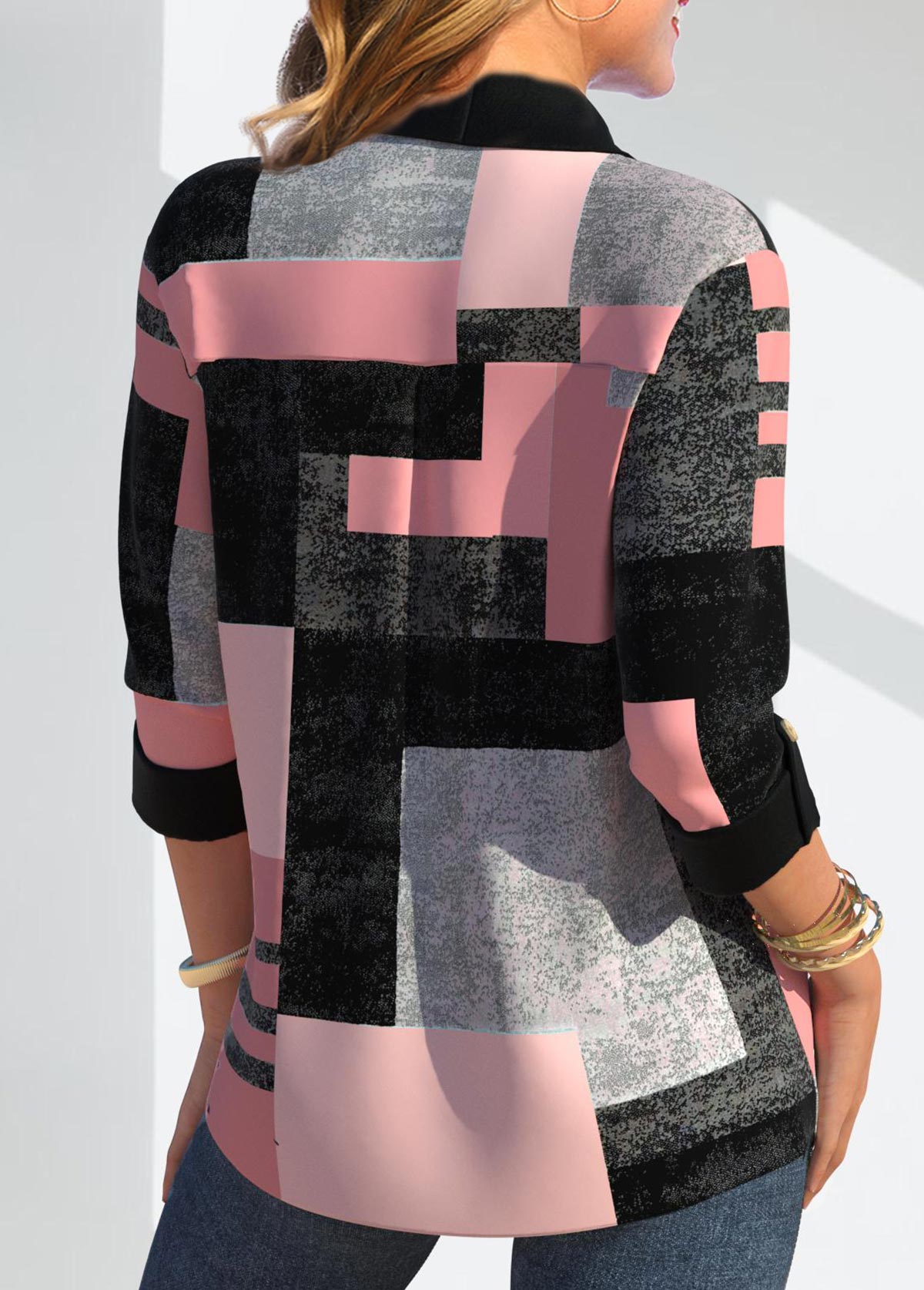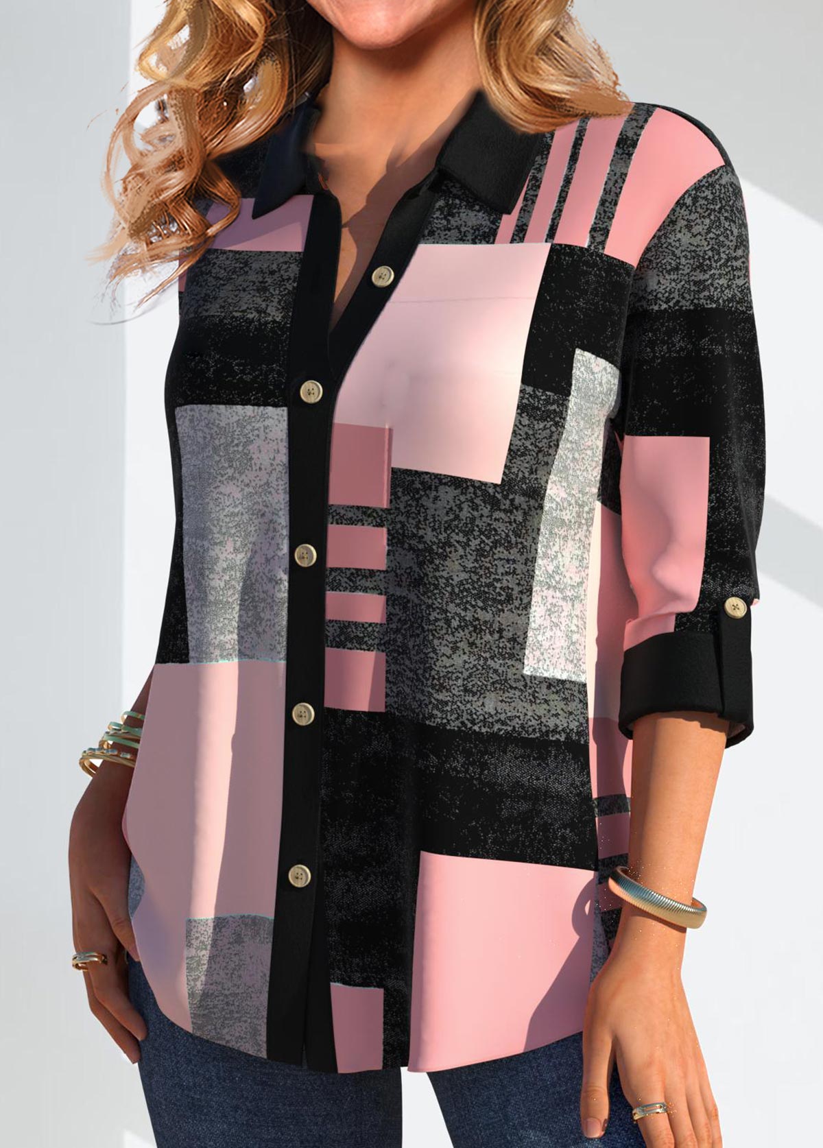 Pink Button Geometric Print Three Quarter Length Sleeve Blouse