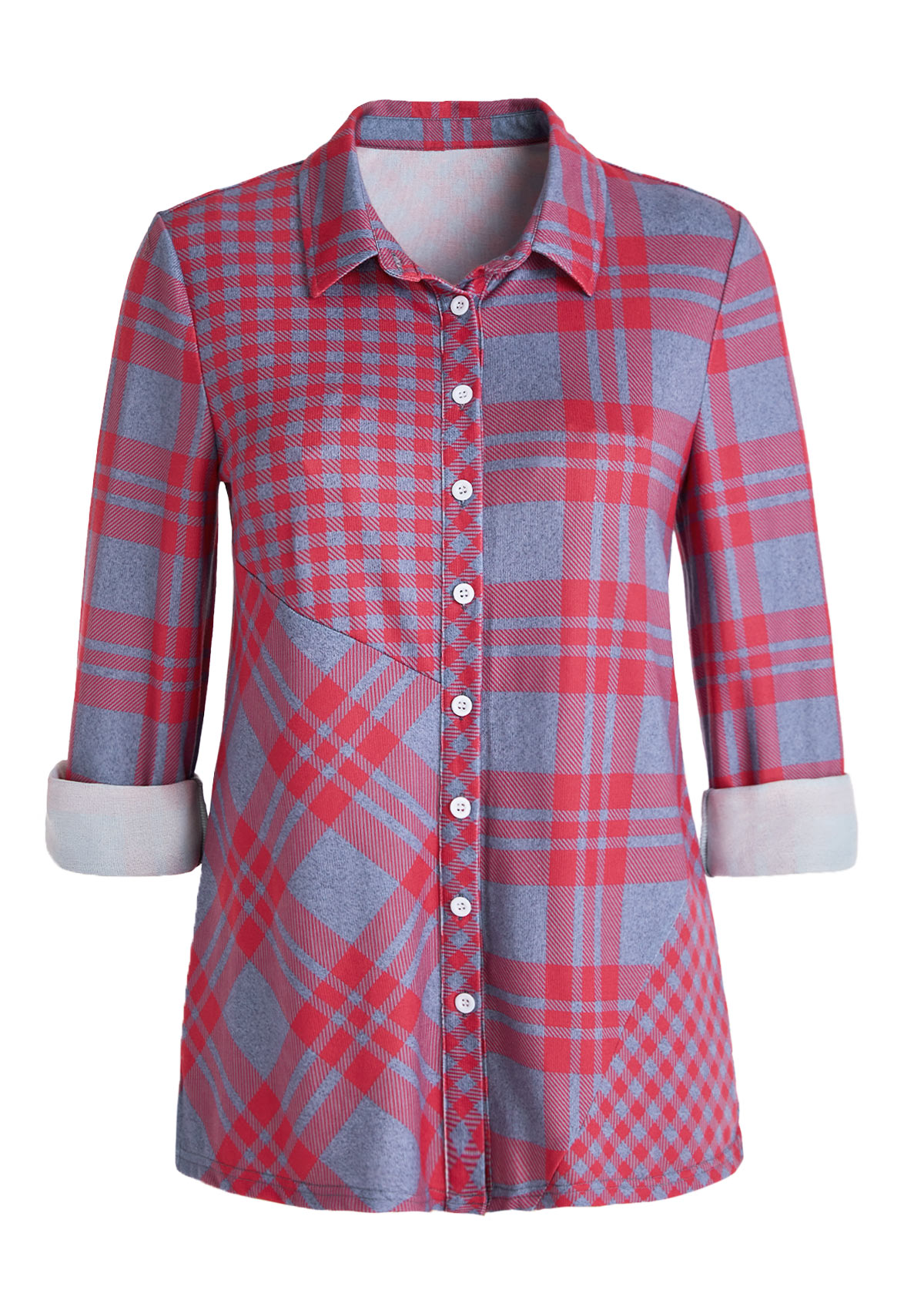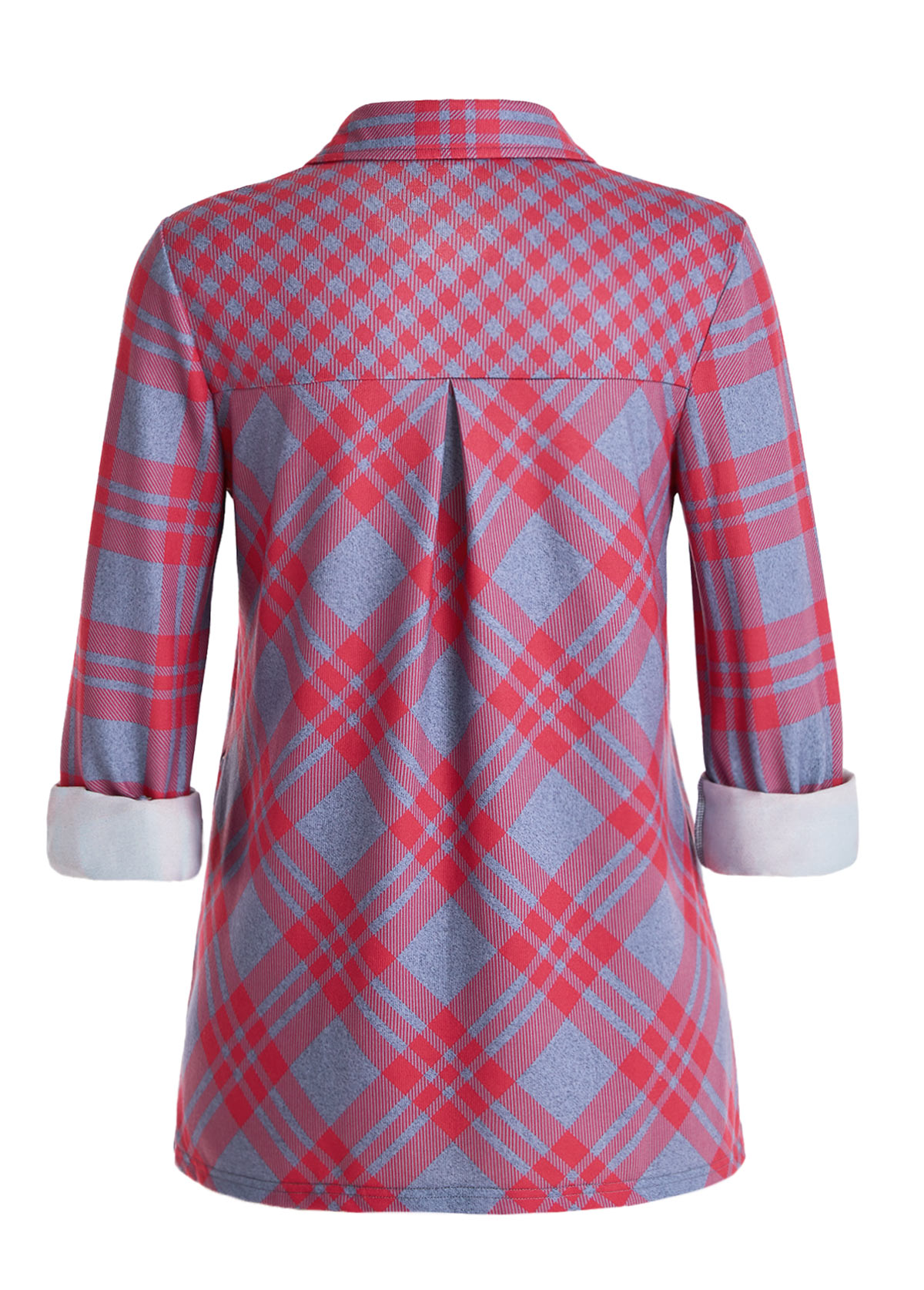 Red Button Plaid Long Sleeve Shirt Collar Blouse