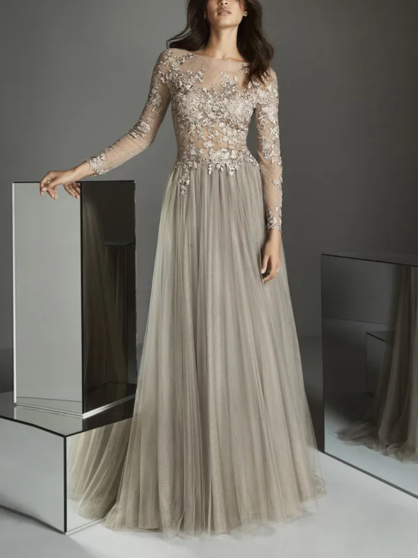 Round Neck Long Sleeve Lace Maxi Dress